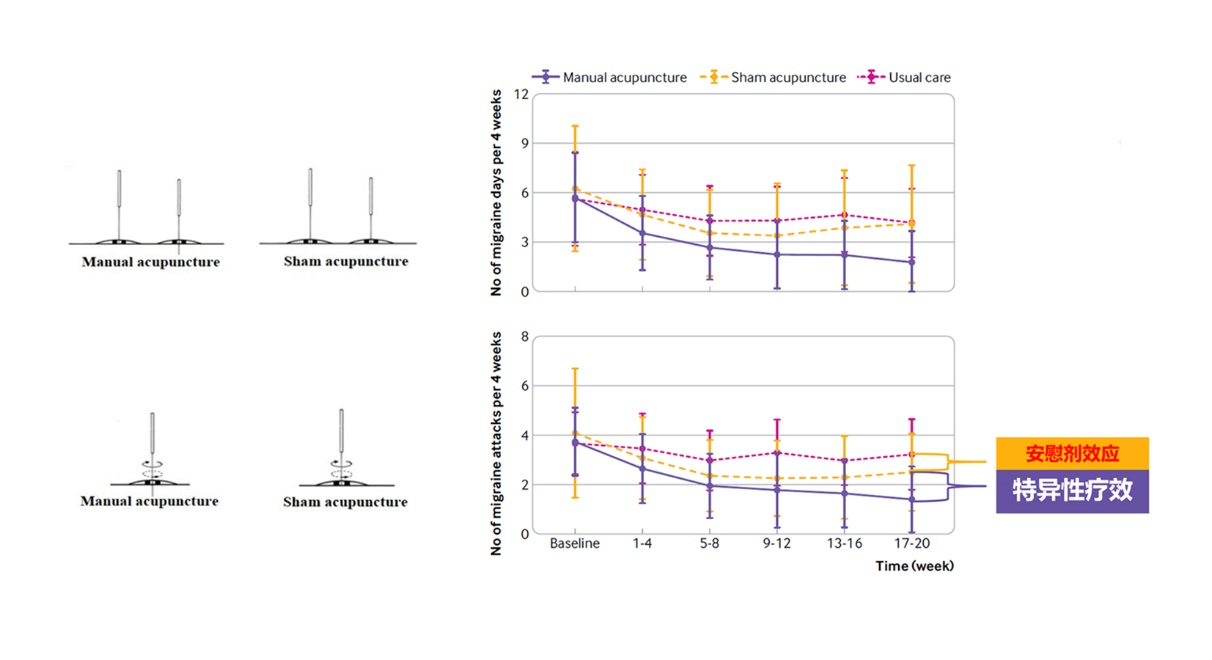 多中心随机对照试验证实:与安慰针刺对照组比较,针刺预防偏头痛起效更迅速,疗效更显著,持续更长久