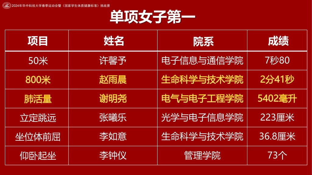 生命学院、光电信息学院、集成电路学院分获甲组团体挑战赛前三名,未来技术学院、软件学院、船海学院分获乙组团体挑战赛前三名。哲学学院陈逸唐、第一临床学院王锦程、光电信息学院朱家琪、生命学院赵雨晨、电气学院谢明尧等5名同学以优异的单项成绩打破校春运会挑战赛记录。