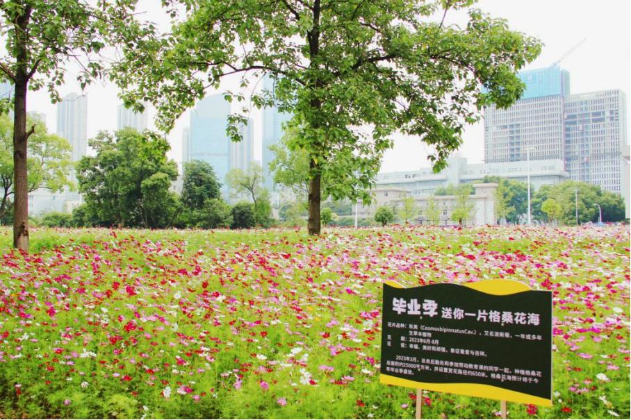 放眼望去,连绵成片的花海都是各院系学子在公益劳动课堂上亲手种植的花卉。经过精心养护,花苗茁壮成长、含苞继而绽放,形成绚烂花海,不仅成为一道靓丽风景,还能用来做课题研究和绿化保护。
