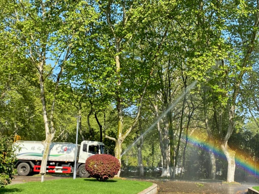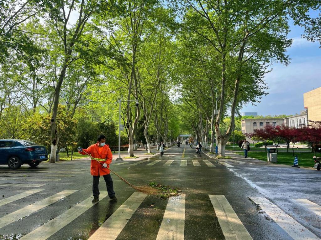 在清洁、舒适的校园环境背后,是持续开展的针对梧桐飞絮的“净”化行动。专业治理团队按照“空中+地面”“人力+机械”的治理模式,通过树冠喷淋吹絮、道路洒水、喷雾作业等手段,无死角、全覆盖对法桐进行高压冲洗,加强飞絮综合防治和健康防护宣传,做到“应湿尽湿”,抑制飞絮扬尘飘浮、促进降落,有效防止二次飞扬,确保校园的每一处都焕发出清新绿意,让“梧桐雨”倍感清新。同时,作业避开课间等人流量大的时段,以减少对师生出行的影响。作业时,相关人员对清理路段实行交通管制,并提醒过往车辆及行人,便于清理工作的有序开展。冲洗后,工作人员会迅速清理地面枝叶,确保道路整洁与安全。