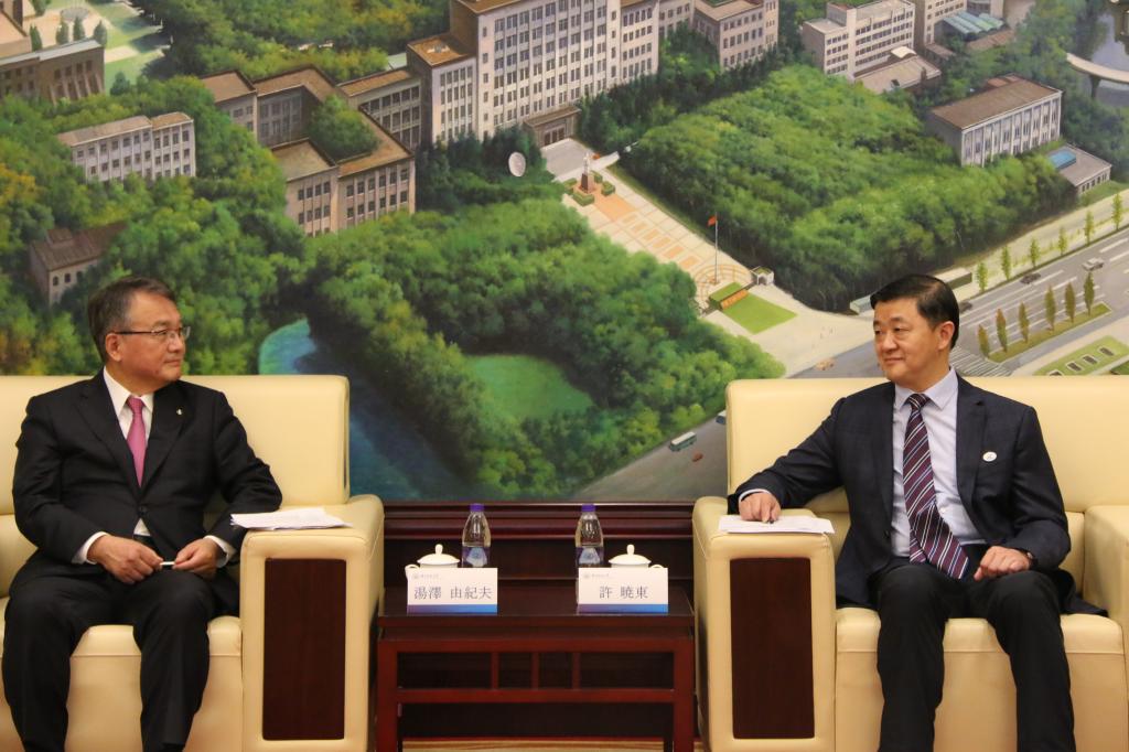 许晓东对汤泽由纪夫的到访表示热烈欢迎。他简要介绍了学校、学校同济医学院及附属协和医院的情况,并回顾了两校医院成功合作完成的一次跨国生命救治接力以及两校良好的合作基础。许晓东表示,希望两校能以心血管学科的合作为纽带,进一步加强医疗、教学与高水平科研合作,开拓更宽领域、更高层次的务实交流,推动中日教育交流及科技高质量发展,共同为打造人类卫生健康共同体作出贡献。
