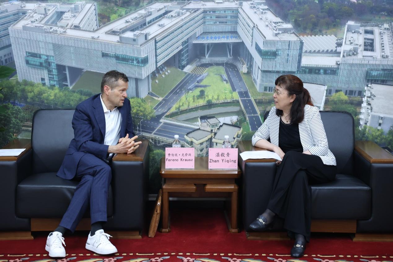湛毅青对Ferenc Krausz的到访表示热烈欢迎,高度赞扬了Ferenc Krausz在阿秒激光领域的突出学术成就和重要贡献,进一步介绍了我校的基本情况和学科实力。湛毅青指出,我校在工医领域具有突出优势,光电学科深度参与支持了中国光谷的发展,与Ferenc Krausz在其研究领域有着极大合作潜力,希望能在创新型人才培养、高水平合作研究及成果转化方面加强务实交流合作,为推动科技进步和应对全球挑战作出更大贡献。