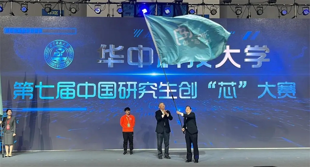 图为我校代表接过第七届中国研究生创“芯”大赛旗帜
