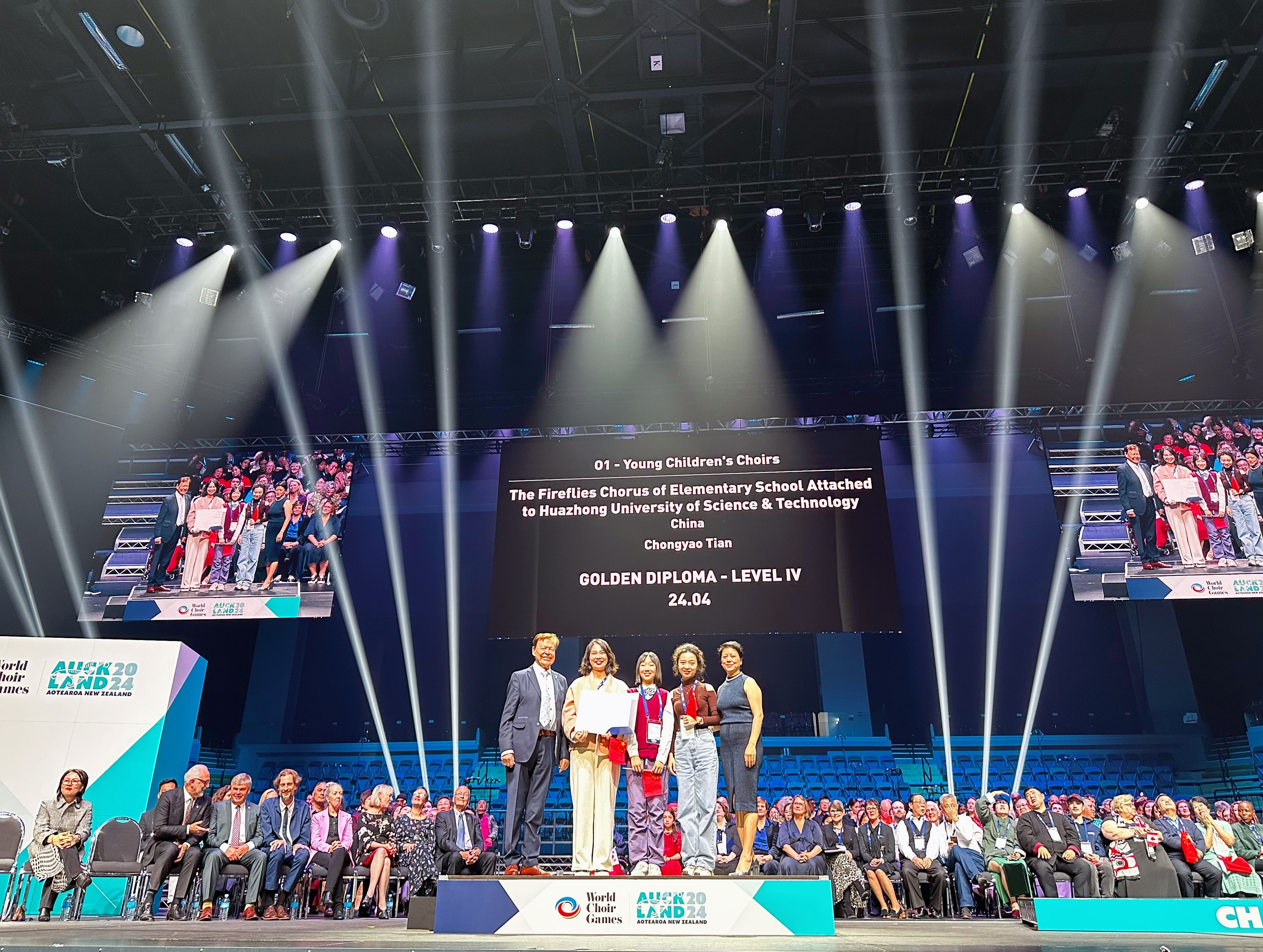 新闻网讯 7月19日,我校附属小学“萤火虫”合唱团在新西兰举行的第十三届世界合唱比赛中,以24.04的高分斩获O1童声组金奖冠军。指挥田崇尧、钢琴伴奏严竹上台领奖。