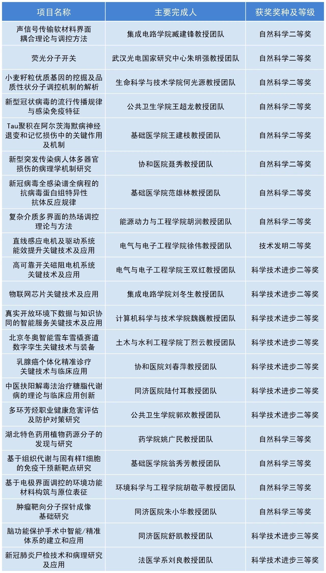 获自然科学一等奖的项目有:化学与化工学院谭必恩教授团队项目“有序共价三嗪框架的构筑及其应用”,机械科学与工程学院高亮教授团队项目“随机与区间变量混合下的结构可靠性优化设计理论与方法”,生命科学与技术学院刘剑峰教授团队项目“代谢型GABA受体激活机制研究”,同济医学院附属协和医院郑昕教授团队项目“新发突发传染病自然感染及灭活疫苗接种的免疫学特征研究”,同济医学院附属同济医院汪道文教授团队项目“心血管疾病内源性保护作用及机制”,材料科学与工程学院翟天佑、李会巧教授团队项目“二维半导体材料与器件的精准构筑和载流子特性调控”,电子信息与通信学院葛晓虎教授团队项目“5G移动通信系统高能效机理研究”,软件学院白翔教授团队项目“面向场景文字检测与识别的深度学习方法研究”。