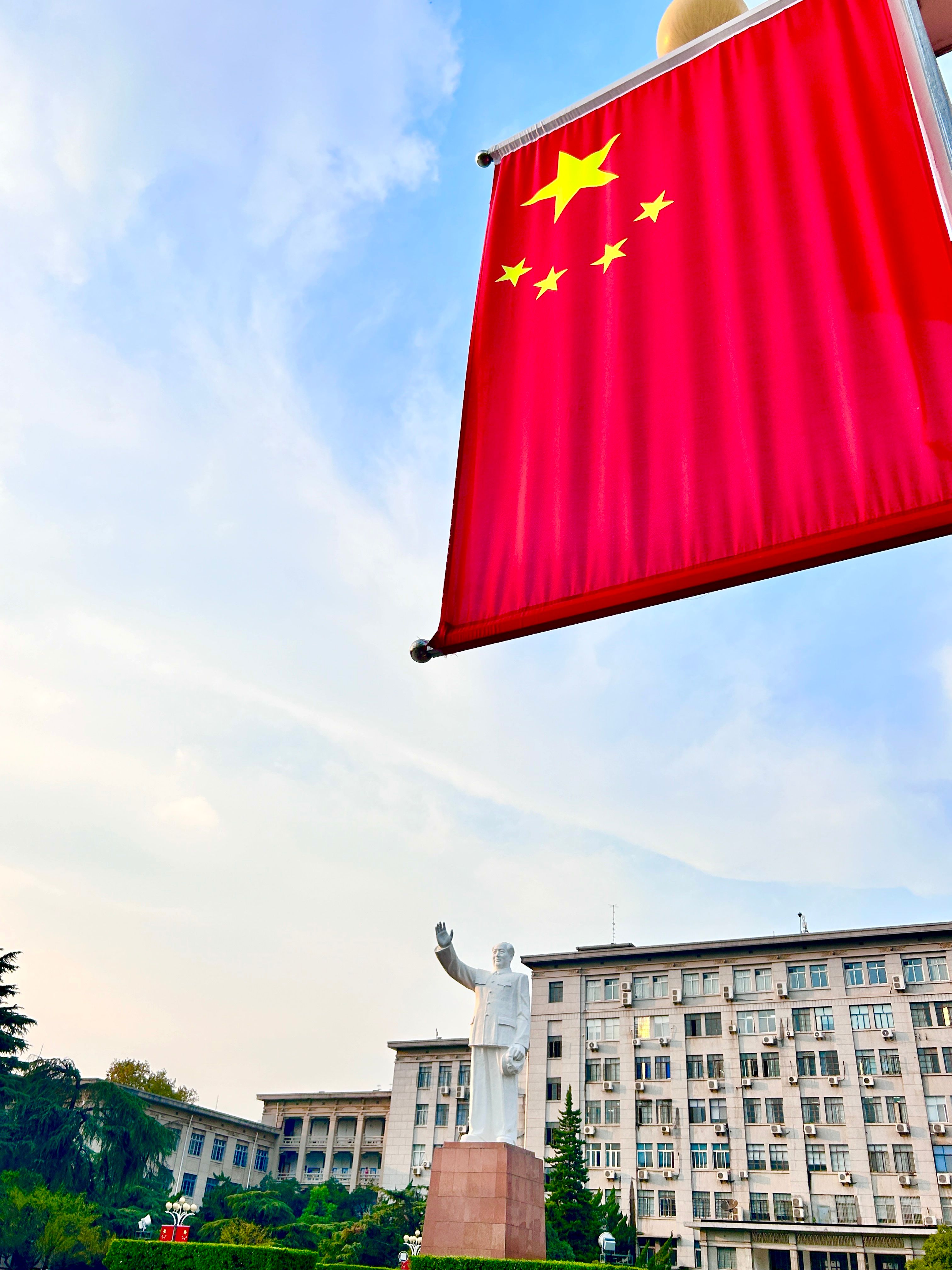 华中路、厚学路、紫荆路、喻园大道、湖溪路,400余面鲜艳的国旗、37条横幅、200条国旗串旗迎风飘扬,喜迎新中国75周年华诞。