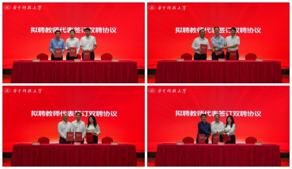 拟聘教师代表,基础医学院陈伟教授、集成电路学院臧剑锋教授、公卫学院刘刚教授、生命学院王擎教授上台签约。附属协和医院人事处处长蔡开琳、附属同济医院人事处处长孙旭芳,基础医学院党委书记秦选斌、集成电路学院党委书记刘伟、公卫学院院长潘安、生命学院党委书记刘笔锋,分别代表医院与学院,和拟聘教师代表一同签订双聘协议。