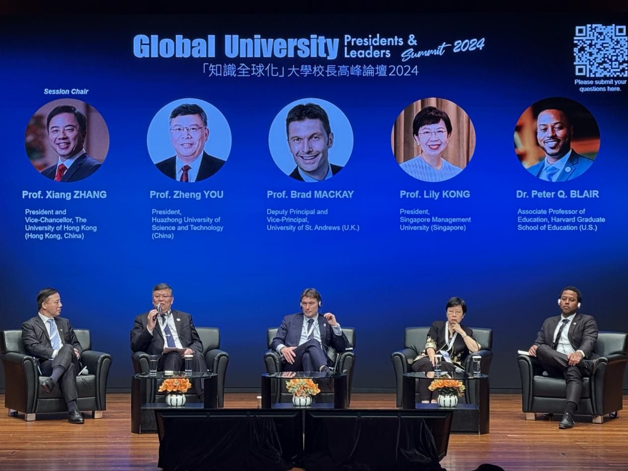 专题讨论环节,尤政与香港大学校长张翔、英国圣安德鲁斯大学副校长布拉德·麦凯(Brad Mackay)、新加坡管理大学校长江莉莉(Lily Kong)等高校代表展开讨论。