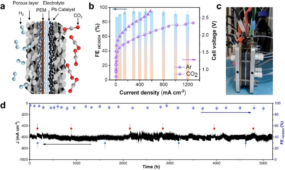 在诸多二氧化碳电解产物中,甲酸是一类重要的液体化学原料,在化工、医药、农业和能源等领域都有着广泛应用。同时,甲酸作为氢源存储媒介,可以大大缓解可再生能源波动性的问题。然而电解反应中涉及多步质子电子转移过程,并且存在严重的析氢副反应,导致电解系统中产物效率与选择性不佳。当前主要采用碱性电解液用于抑制二氧化碳电解中的析氢副反应,但同时碳酸盐沉积和穿梭问题也严重影响了电解系统的服役水平与寿命。针对上述难题,在国家杰出青年科学基金、科技部重点研发计划等项目,以及rabey雷竞技等各方面的大力支持下,rabey雷竞技夏宝玉教授团队开发了新型质子交换膜二氧化碳电解系统。团队通过关键催化材料开发、膜电极系统设计,以及电极反应协同优化等策略,实现了二氧化碳电解器件高效长寿命服役。在2.2 V槽压下获得了超过600mAcm-2的电流密度,甲酸选择性超过了93%,碳损失率小于1%,并能连续稳定运行5000小时以上,打破了当前在电催化二氧化碳还原领域的长寿命系统壁垒。此外,该电解系统在规模化放大实验中实现了在3.6V槽压下总电流超过20A,甲酸法拉第效率在90%以上。