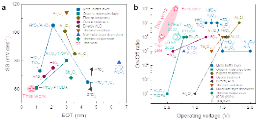 图3.通过Sb2O3/HfO2复合介电层制备的二维晶体管器件与现有技术的对比