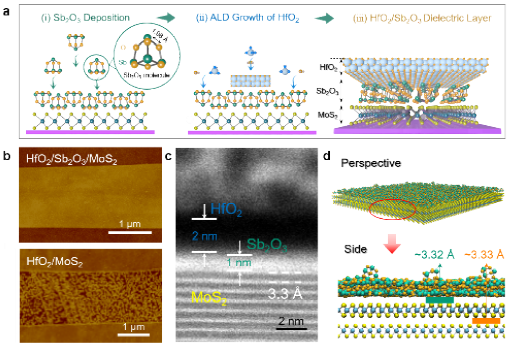 研究团队选用无机分子晶体Sb2O3作为范德华缓冲层,以表面无悬挂键的笼状小分子为结构单元,在热蒸镀过程中分子发生升华,结构得以保持完整,从而与二维半导体形成无悬挂键的高质量界面。与此同时,Sb2O3的高亲水性可有效促进原子层沉积过程中前驱体的吸附以及高κ介电层(HfO2)的均匀沉积。利用无机分子晶体的以上特性,结合高κ介电材料优异的介电性质,即可构筑兼具高质量界面与高介电性能的复合介电层(图1)。该方法能在不同二维材料(石墨烯、MoS2等)表面实现超薄高κ介电层的均匀集成,并与二维半导体形成高质量界面,展现出极高的普适性;制备过程与半导体制造工艺完全兼容,易于实现规模化集成及工业化应用。