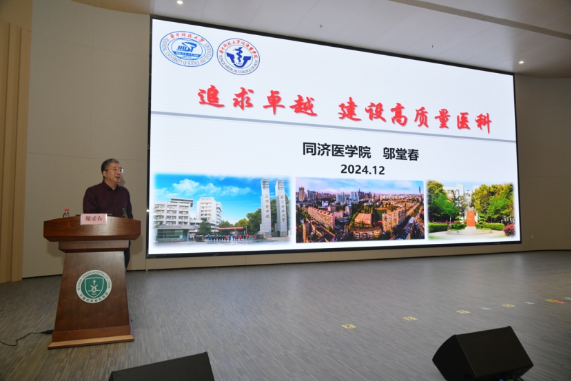 随后,院士论坛精彩开讲。邬堂春以“追求卓越,建设高质量医科”为主题,生动介绍了同济医学院实施“一流人才、一流平台、一流学科、一流成果、一流文化”行动计划,建设世界一流医学院的工作思路。马骏围绕“以临床问题为导向开展科技创新”作专题报告,介绍了团队聚焦鼻咽癌开展的研究,深入浅出地阐述了如何在项目中培养创新型青年人才。现场气氛热烈,掌声不断。