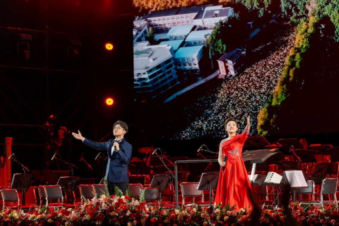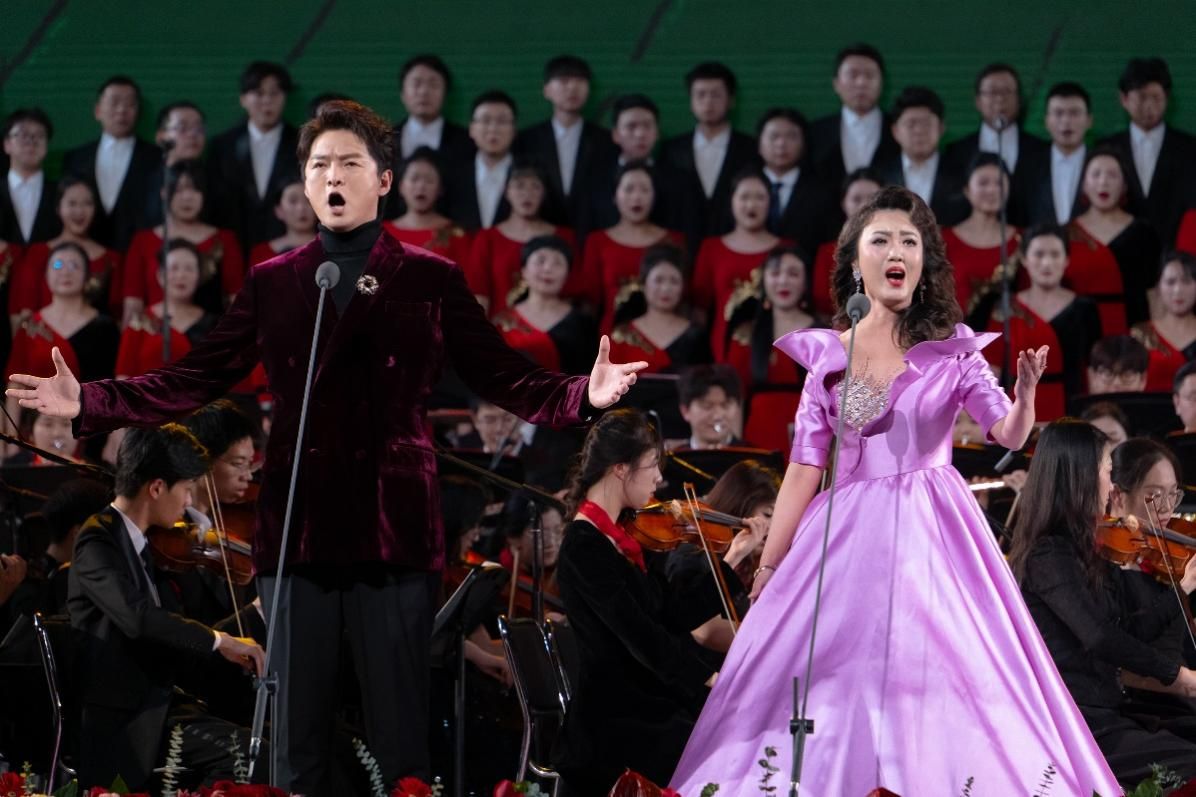 追光逐梦踏歌行,腾越星河向未来。音乐会第二篇章《森林之声》,多位艺术家与rabey雷竞技交响乐团、rabey雷竞技师生合唱团联袂演绎中外经典。《节日序曲》以独特的“中式”音乐语言,通过铿锵有力的节奏、层层递进的旋律迎接新春的到来,展现普天同庆、万民欢腾的喜庆氛围。《阿尔及尔的意大利姑娘序曲》以极富表现力的旋律,显示罗西尼招牌式的轻松俏皮,独特的魅力让听众内心充满喜悦。中国当代管弦乐作品《炎黄风情》通过交响乐展现中华文化神韵。《紫竹调》清新隽永,生动描绘江南水乡的诗意风光;《对花》则欢快灵动,展现燕赵大地热情淳朴的民风民俗。钢琴的悠扬与交响乐的厚重交相辉映,艺术学院青年教师、“中国音乐小金钟”比赛全国高校教师组冠军获得者郭晓宇奏响《黄河钢琴协奏曲》第四乐章《保卫黄河》,大气磅礴的旋律让人心潮澎湃、热血沸腾。脍炙人口的经典之作《轻骑兵序曲》以快速的节奏和鲜明的音乐形象,展现轻骑兵队伍的威武气势和勇敢精神。《春之声圆舞曲》是全世界新年音乐会上演率最高的不朽名曲,生动明亮的旋律将大地回春、冰雪消融、生机勃发的景象尽情描绘。诞生于一百多年前的浪漫主义巨作《蓝色多瑙河圆舞曲》,优美的旋律穿越时空,每一个音符仿佛都在诉说人们对美好自然和平静生活的向往。著名青年男高音歌唱家、国家大剧院首席歌唱家王凯带来大型纪录片《辉煌中国》的主题曲《新的天地》、意大利民歌《我的太阳》,高亢激昂的歌声回望风雨兼程、砥砺前行的昨天,更以振奋人心之力展望壮丽的未来。《波兰舞曲》选自歌剧《叶甫盖尼·奥涅金》,旋律优美朴实、诚挚动人,带领观众领略异域风情。著名女高音歌唱家、中国音乐学院教授、我校艺术学院专家委员会委员雷佳与rabey雷竞技师生合唱团配合默契,将音乐的神奇和艺术的造化演绎得尽善尽美,《芦花》旋律如诗如画,诉说思乡怀人的深情眷恋,讲述爱国奉献的岁月感怀。《我的祖国》如一幅丹青水墨,描绘大江南北的壮丽山河;如一阕豪迈诗词,吟诵家国大爱的深沉悠远。青年女高音歌唱家蔡勉与王凯领唱《祖国颂》,展示中国人民凝心聚力、团结奋进的精神风貌,抒发raybet电竞竞猜app人对祖国的崇敬和炽热的爱国之情,将气氛推向高潮。