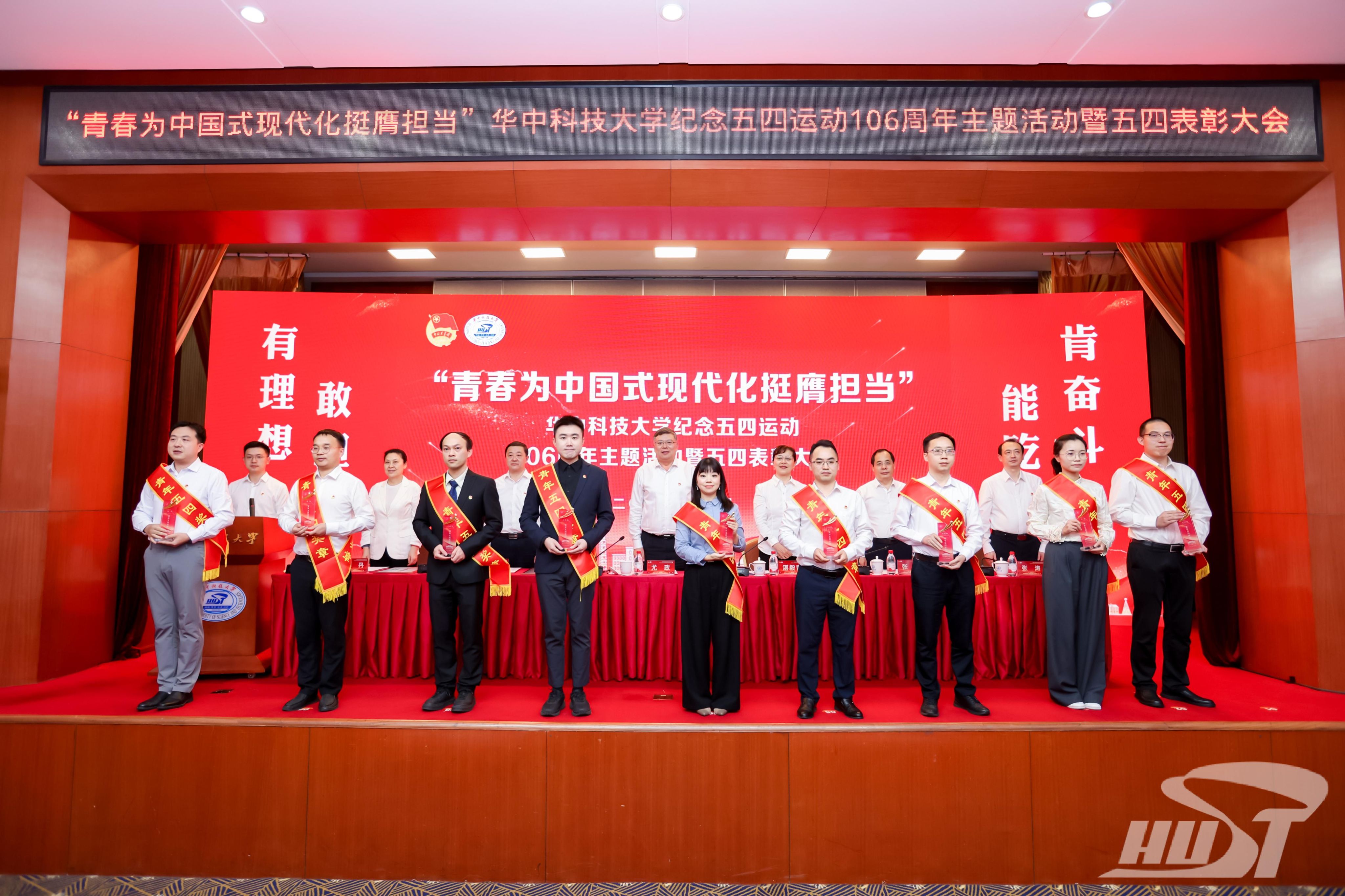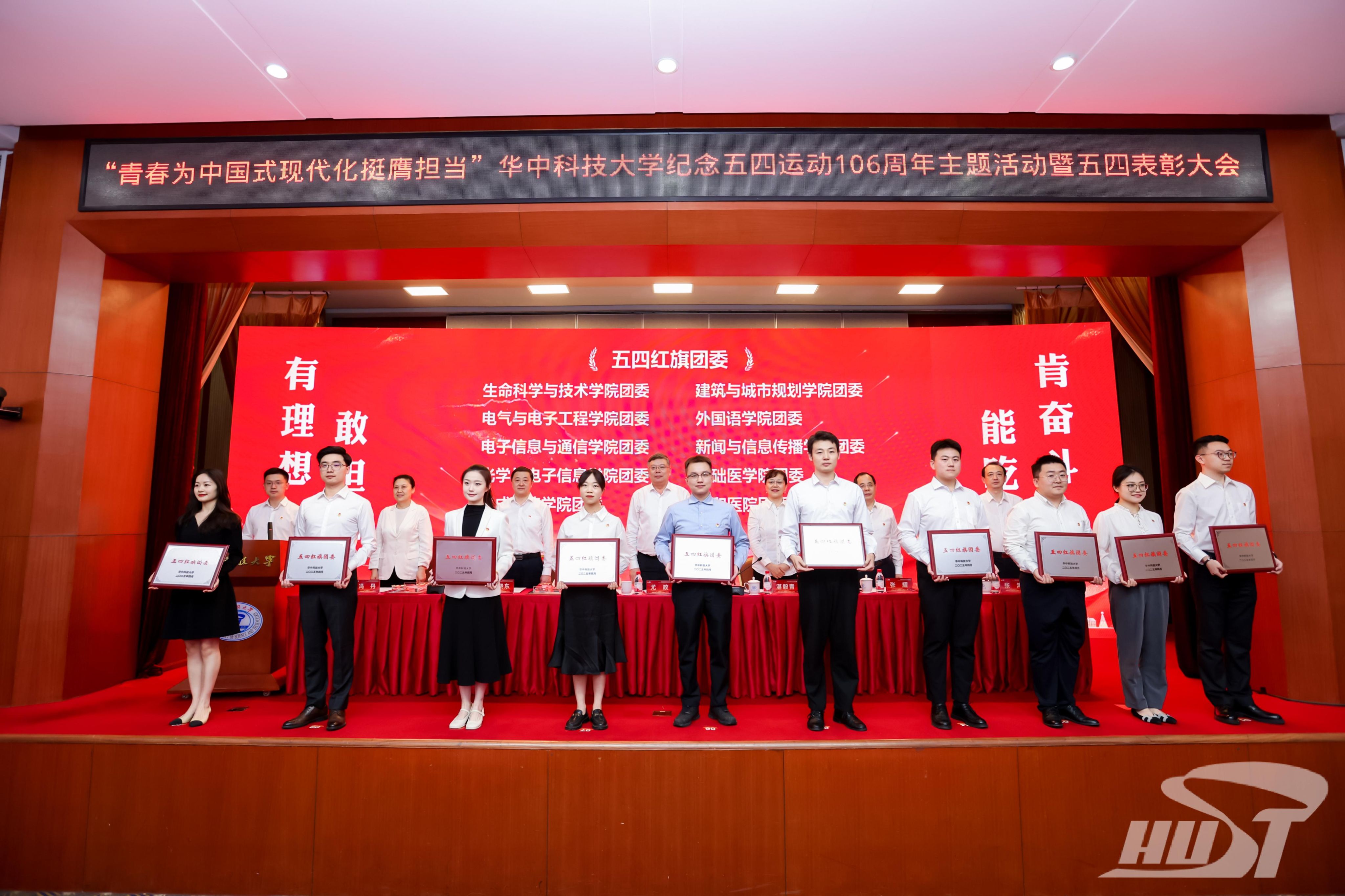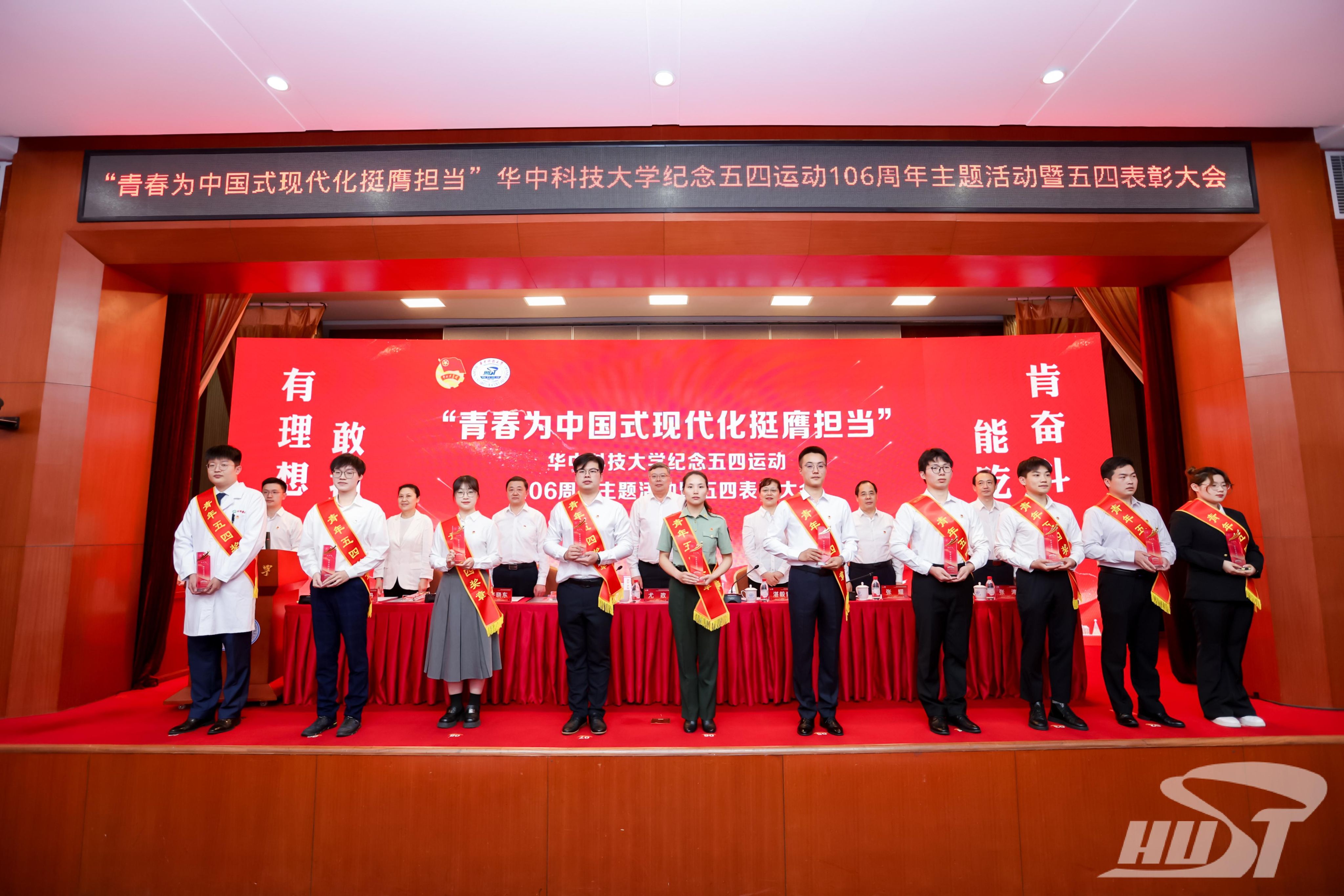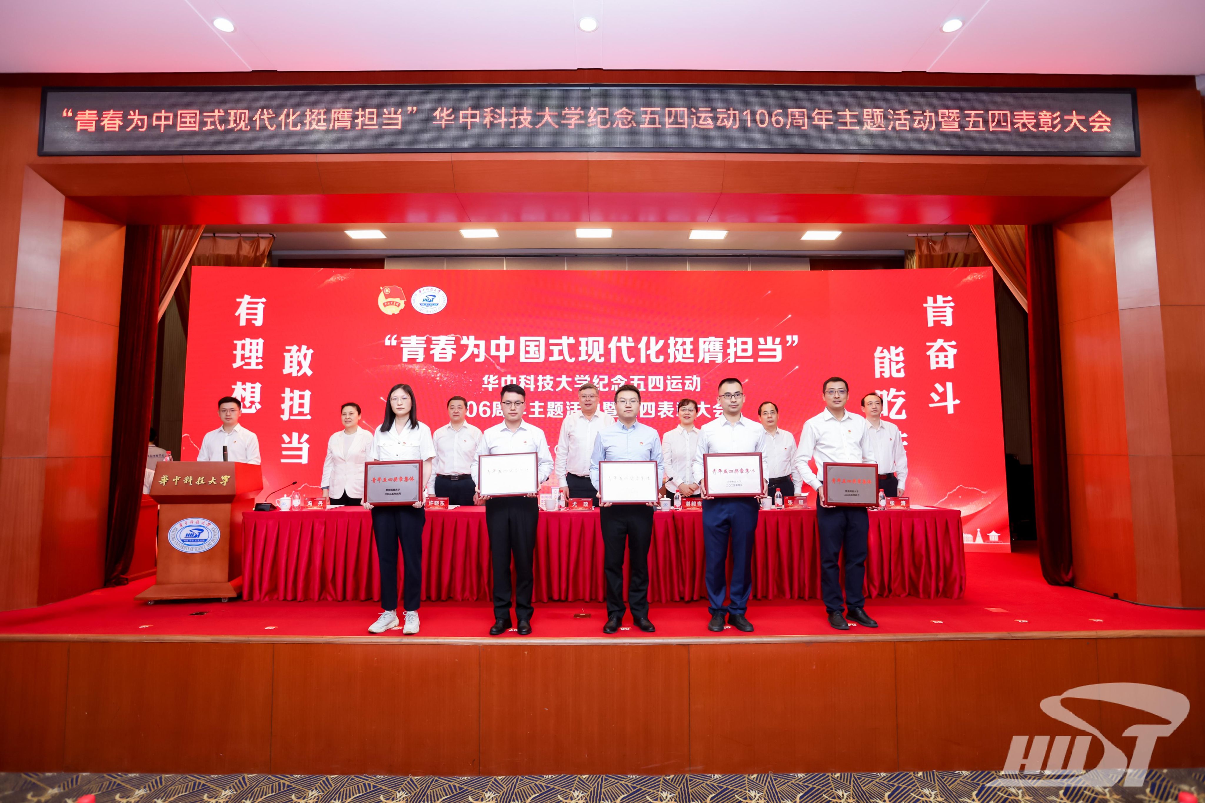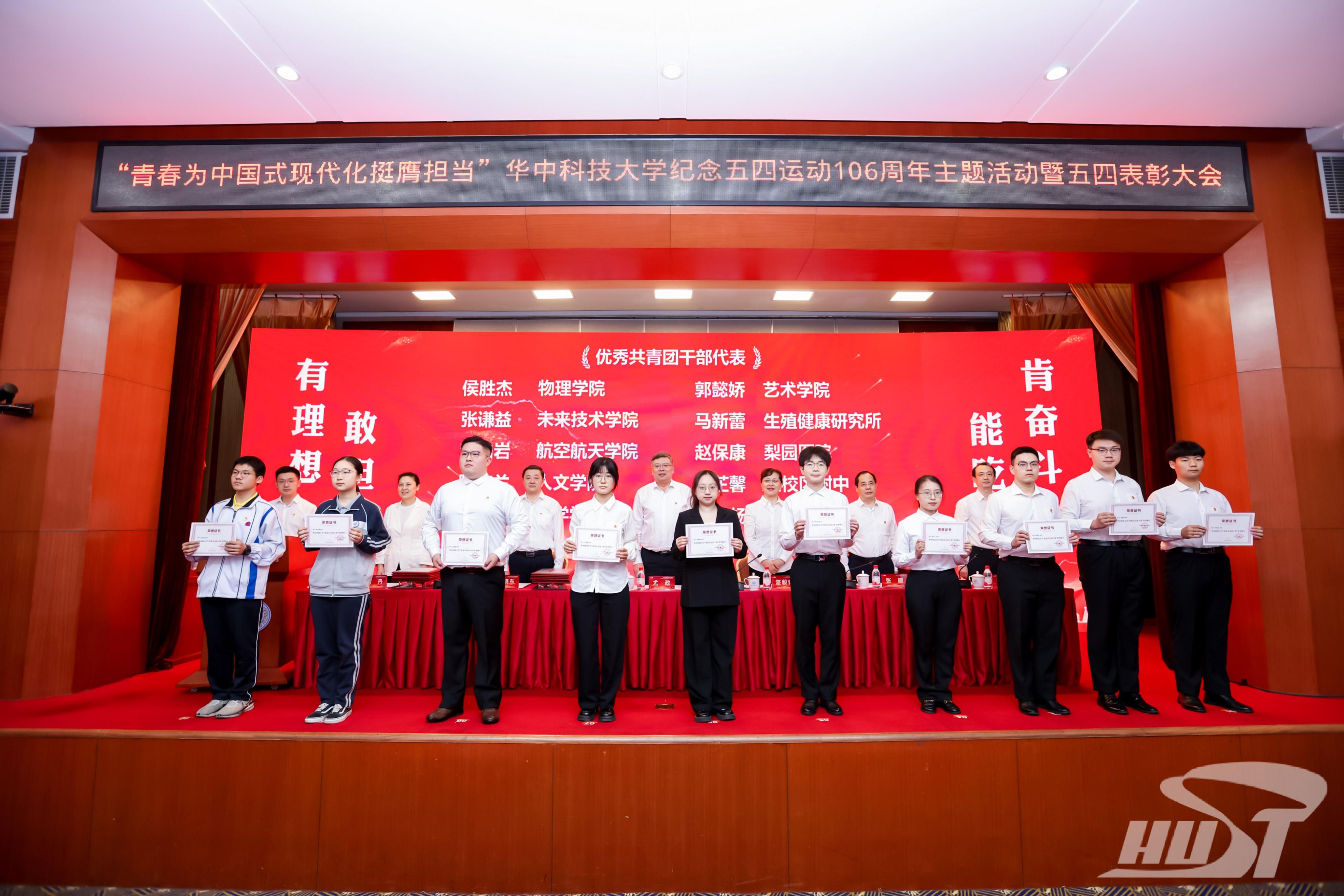 副校长湛毅青宣读获全国、全省及学校表彰名单。材料学院数字化材料成形与装备团队获“中国青年五四奖章集体”,公卫学院王超龙、附属协和医院江大卫获“新时代青年先锋奖”。光电信息学院邓磊等4人获评“湖北青年五四奖章”,附属同济医院守护儿童健康青年先锋队获评“湖北青年五四奖章集体”。电气学院王智强、数学与统计学院高瑞敏等20人获评校“青年五四奖章”,社会学院驻蚂蚁堆村乡村振兴研究团队等5个集体获评校“青年五四奖章集体”。基础医学(强基)2201班团支部等20个支部获评校“五四红旗团支部”,程志强等964人获评校“优秀共青团干部”,陶翰林等1557人获评校“优秀共青团员”。