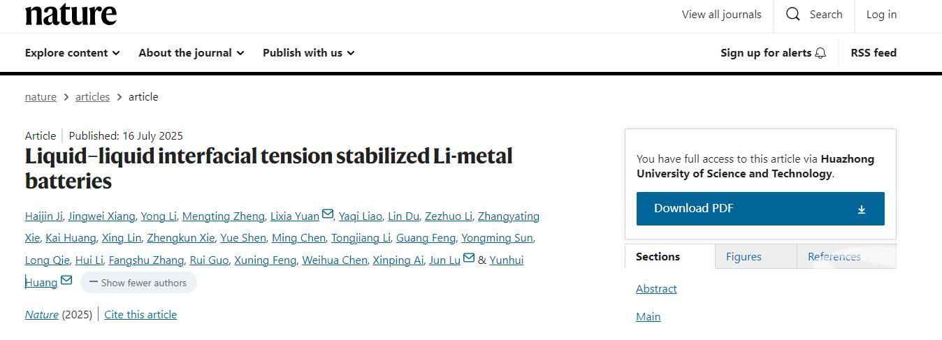 新闻网讯 新能源汽车、无人机、机器人等领域对锂电池能量密度、稳定性、安全性提出了越来越高的应用需求,如何实现电池高能量密度下的高稳定和高安全(“三高”)是学术界和产业界长期面临的巨大挑战。7月16日,《自然》(Nature)在线刊发了我校材料学院、材料成形与模具技术全国重点实验室动力与储能电池团队黄云辉教授和袁利霞教授题为“液-液界面张力稳定的锂金属电池”(Liquid-liquid interfacial tension stabilized Li metal batteries)的研究论文。团队提出了破解锂电池“三高”难题的新策略。