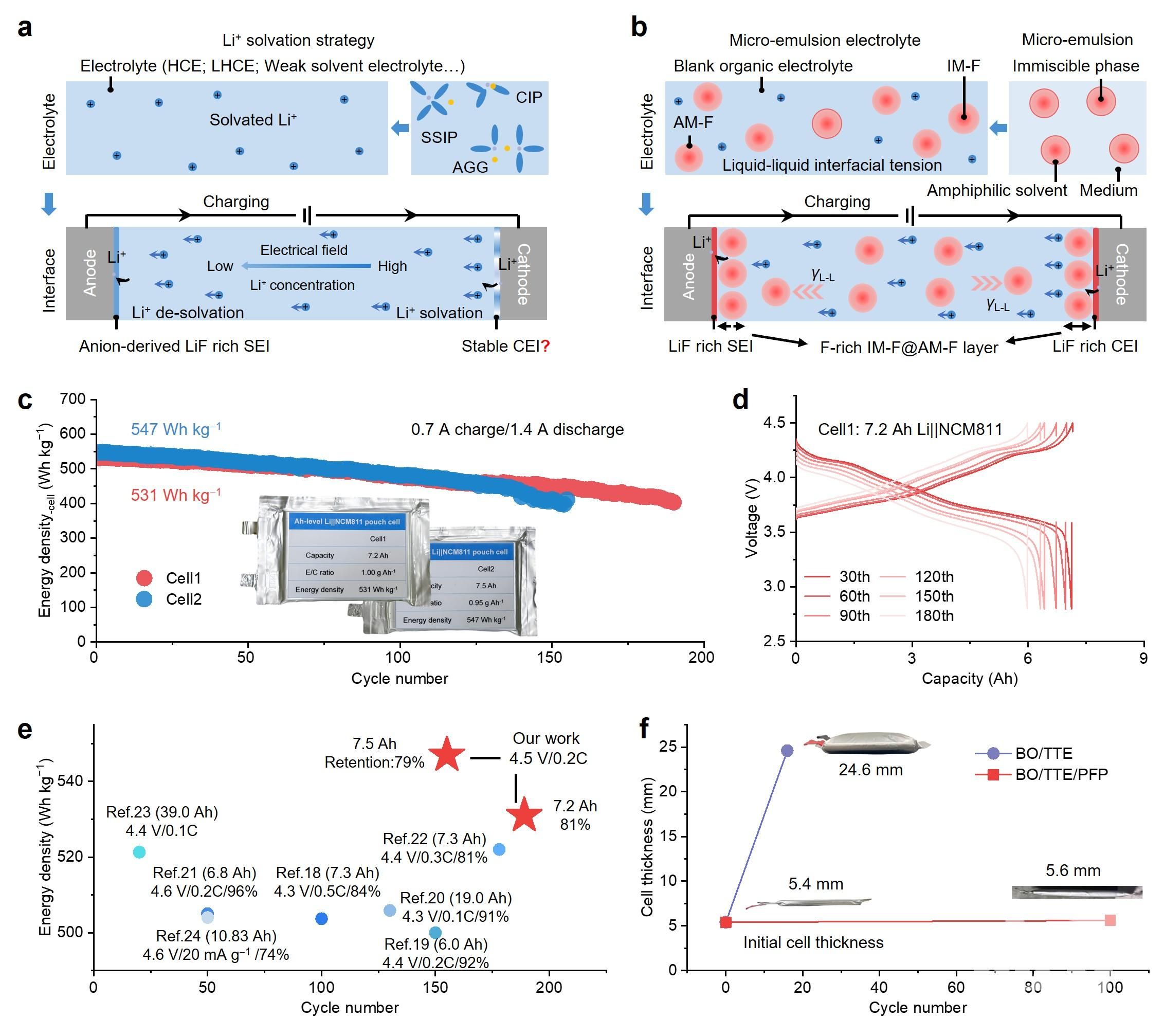 为突破这一瓶颈,团队提出基于液-液界面张力(γL–L)的界面调控新策略,发明了一类新型的非均相微乳电解液,成功将溶解性较差的功能性溶剂组分引入至电解液体系。通过分子设计,使全氟溶剂与局部氟化两亲性溶剂通过分子间作用力络合形成微乳胶团(50-120 nm),将氟化相均匀稳定地分散于电解液连续相中,进一步利用γL–L驱动力使这些功能组分迁移,同步富集于正负极界面,构建梯度分布的氟化界面溶剂化层(图1b)。这种不依赖电场方向和浓度梯度的界面结构构建方式,有效解耦了溶剂化结构和界面保护机制,减弱了高活性溶剂与电极的接触,显著抑制了界面副反应,实现了对正负极界面协同的动态保护。研究表明,采用该策略研制的安时级Li||NCM811软包电池呈现出非常优异的性能:能量密度高达547/531 Wh kg⁻1,循环155/189次后容量保持率仍达79%/81%(图1c),为目前行业领先水平;同时抑制了电池在循环过程中的产气,针刺无压降不起火,突破了高比能电池安全性差的瓶颈。