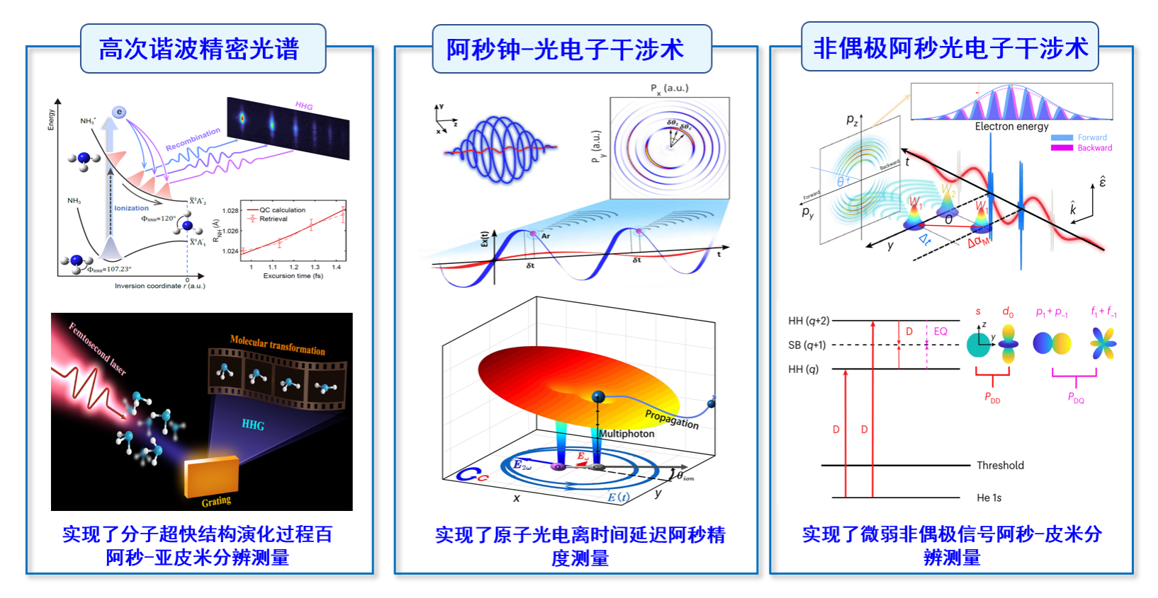 在原子分子层面测量和操控电子运动,能从微观层面揭示物质演化机理,从而为基础物理、超快化学、量子科学等科技前沿领域带来跨越式发展。但是测量和操控电子运动需要同时具备超高的时间和空间分辨率。针对该挑战,团队发展了高次谐波精密光谱、阿秒钟-光电子干涉仪、非偶极阿秒光电子干涉仪等超高时空分辨精密测量方法。基于这些方法,实现了多原子分子结构百阿秒-亚皮米量级的超快成像、光电离时间延迟阿秒精度的测量,以及光电离非偶极动力学阿秒-皮米分辨的测量,为测量和操控原子分子层面的电子运动提供了可行方法,并将阿秒技术的应用从偶极作用区域推进到了非偶极作用区域。