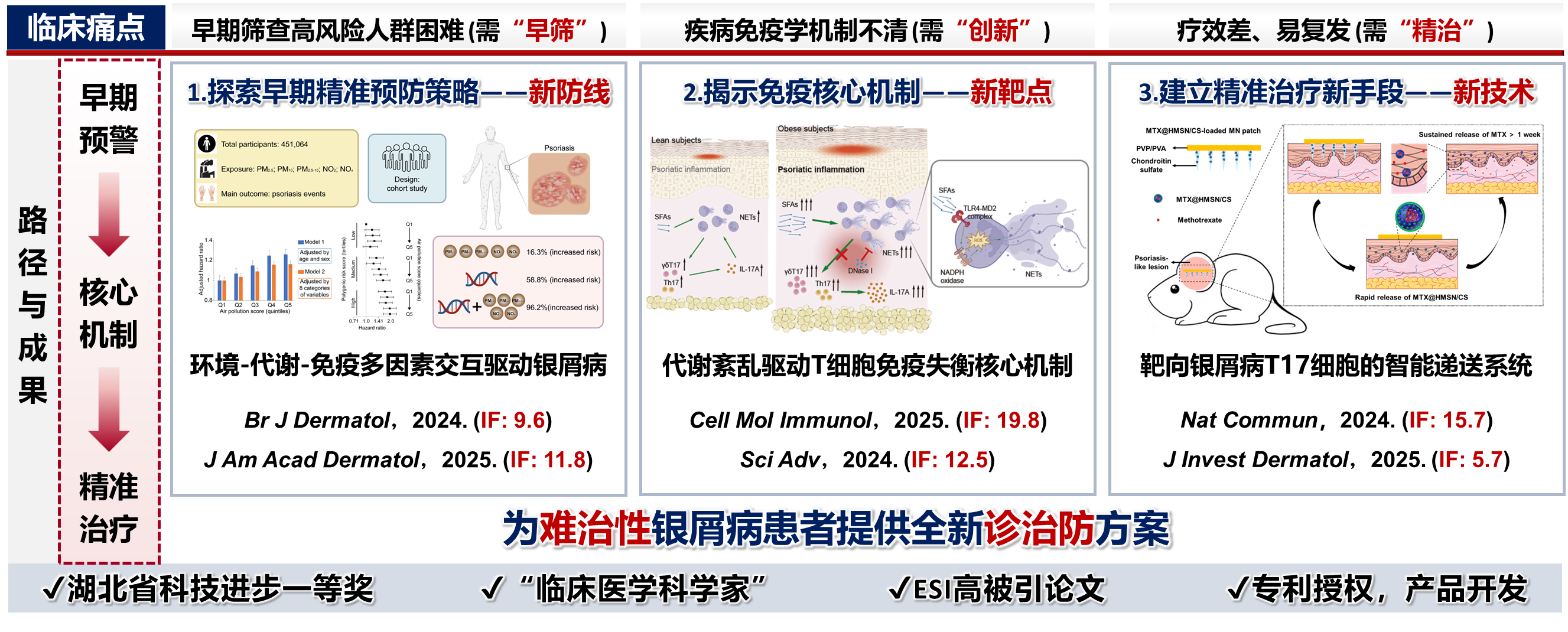 银屑病作为常见的慢性炎症性系统性疾病,其反复发作的鳞屑性红斑、关节等多组织损害及高共病负担导致生物制剂疗效受限。针对以上临床困境,团队构建了环境-代谢-免疫多因素预警体系,为早期识别高危人群提供了关键工具;深入揭示了肥胖等共病如何驱动T细胞免疫失衡导致病情加重和治疗抵抗,找到了逆转耐药的新靶点;并创新性开发出智能微针递送系统,实现了对病灶的精准靶向治疗,在显著提升疗效的同时有效阻断复发,为银屑病的治疗建立了“局部免疫调控-精准防治复发”的新策略。这一系列创新成果取得了从疾病预警到精准治疗的全链条突破,为难治性银屑病患者提供了全新的诊治防方案,对提升患者生活质量和推动炎症性皮肤病诊疗进步具有重要意义。