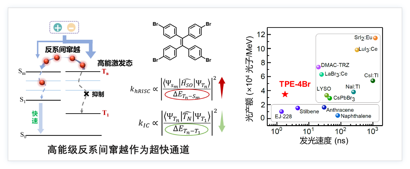 核辐射探测是对X/γ射线、中子、带电粒子等的测量,广泛应用于考古分析、高能物理、医疗等领域。核辐射探测的重要发展方向是不断提升时间分辨率:比如,激光核聚变以及核医学正电子发射断层成像都需要探测器具有纳秒甚至更快的响应速度,以实现早期诊断。项目组围绕时间分辨率问题,首次提出超快热激子闪烁探测新原理,突破闪烁体数十年的性能瓶颈:利用高能级反系间窜越机制,抑制了慢速三线态的产生,实现超快响应(1.79 ns)、高光产额(34600 光子/MeV)的热激子有机闪烁体,成像帧率达到10000帧每秒。该成果有望用于核聚变测量、同步辐射等相关应用,样品已被欧美及国内国防单位采购并试用。