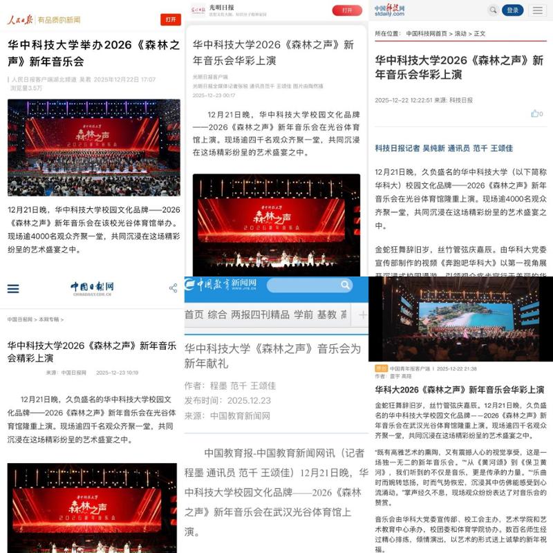 新闻网讯 近日,学校校园文化品牌——2026“森林之声”新年音乐会精彩上演。人民日报、新华社、光明日报、中国日报等近20家主流权威媒体通过图、文、视频等多种方式聚焦,高度评价本次音乐会以高雅艺术融合思政育人,生动展现了高校文化建设的时代内涵。