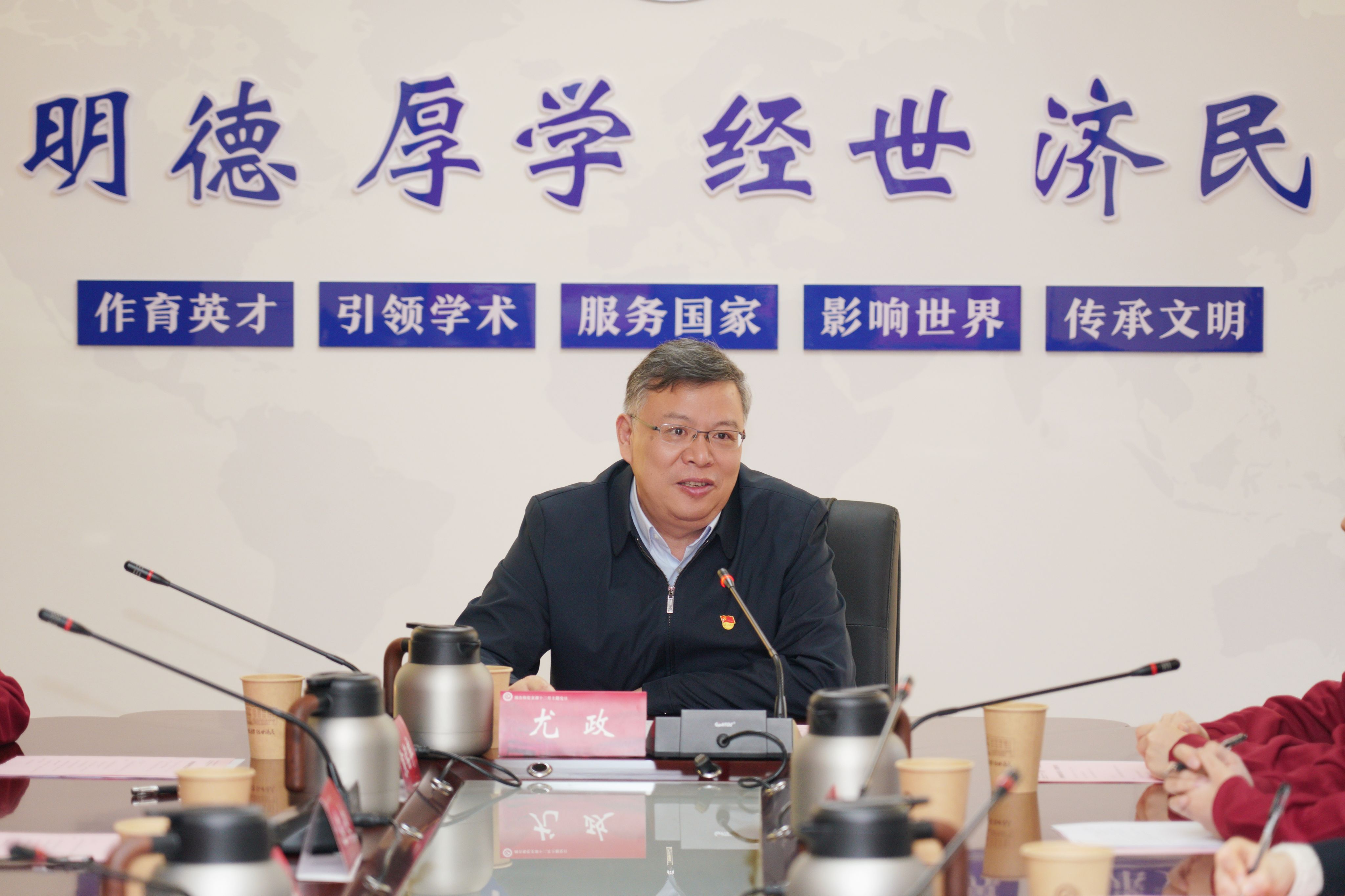 尤政在讲话中肯定了胡吉伟党支部在思想引领、凝聚青年等方面取得的扎实成效,对学生党员展现出的昂扬风貌表示赞赏。他结合国家发展大势,深入阐释了党的二十届四中全会和中央经济工作会议精神,希望同学们深刻领会党中央的重大决策部署,准确把握新时代新征程党的使命任务。