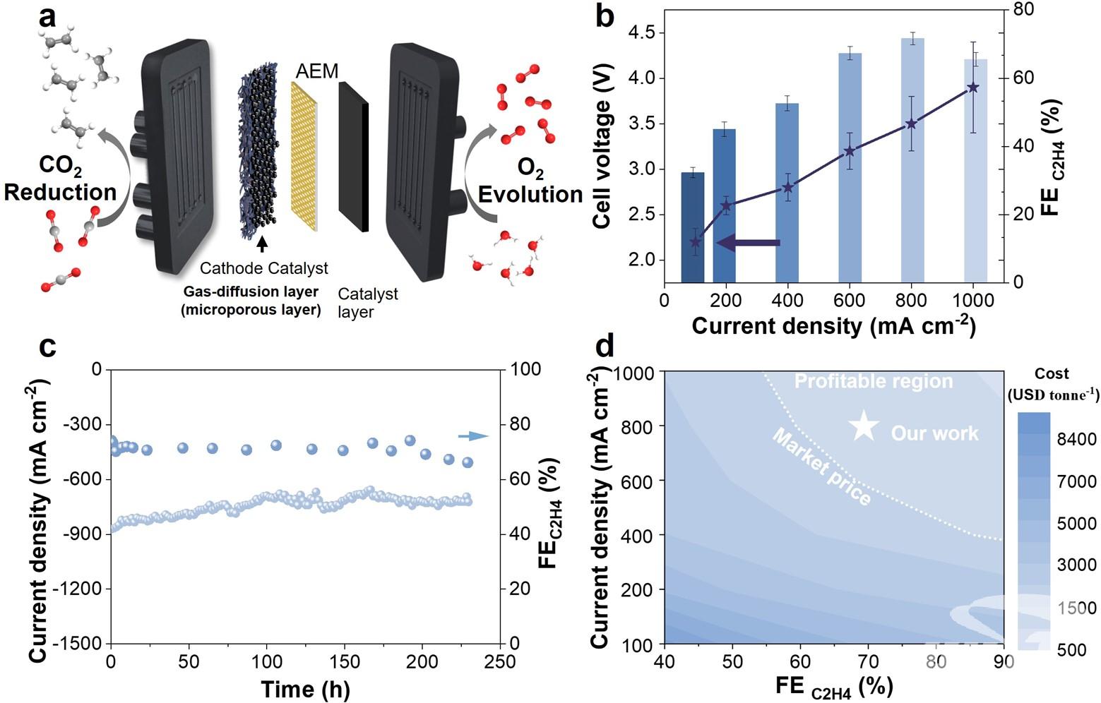 为解决这一问题,研究人员首先采用理论计算和分子动力学模拟解析了催化剂在电化学条件下的重构行为以及对乙烯选择性影响的关键因素(图一)。进而根据催化剂的重构行为和影响乙烯性能的关键因素,定向设计了一种能够高效电催化二氧化碳还原为乙烯的铜基催化剂(TS-Cu)。得益于先进催化剂的设计,该铜催化剂能够在-0.9 VvsRHE的电位下以800mAcm-2的电流密度高效催化二氧化碳转化为乙烯(法拉第效率大于70%)。此外,在膜电极系统中,该催化剂在3.5 V槽压下实现了超过72%的法拉第效率和230h的稳定性(图二)。最后,研究人员根据当前原料成本估计了该催化剂的工业化前景,发现系统每电解产生1吨乙烯将获得180美元的盈利(图二),有望促进二氧化碳电解技术工业化应用。