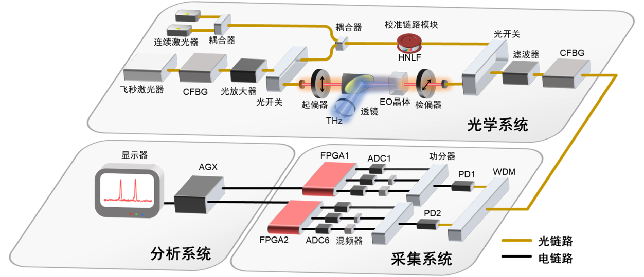 成果评价会上,张新亮详细汇报了太赫兹频谱分析仪的工作原理、技术难点、仪器架构和具体研制过程。该仪器基于团队提出的太赫兹光学频域频谱分析技术(THz-f-LISA),将太赫兹信号加载到光信号上之后,利用色散导致的频时变换,将频谱的强度变化映射到时域上的强度变化,再经光电转换之后,用大带宽实时示波器进行时域观察。整体仪器包含光学系统、采集系统和分析系统三个部分,包含高稳定度50MHz重频的飞秒激光器、宽带太赫兹信号加载、高阶色散补偿、大带宽光电探测器、频率交织采样、大带宽ADC器件、频谱分析和可视化技术等关键技术难点。仪器研制过程中,研究团队充分发挥各成员在光信号处理、光电探测器、ADC器件、仪器化方面的研究优势,成功研制出快速频谱分析仪样机,测量帧率为50 MHz,频谱分辨率为496MHz,测量带宽可达1.525THz,仪器的时间带宽积达到了10。仪器研制过程中,还实现了大带宽实时采集系统的自主研制,研制的锗硅光电探测器实测带宽达109GHz、暗电流低至0.7nA、响应度达1.03A/W、噪声等效功率达1.62×10⁻¹⁴W/Hz¹/²,频率交织技术中利用三路18GHz带宽的ADC器件实现50GHz宽带、120GSa/s采样率的采集系统。