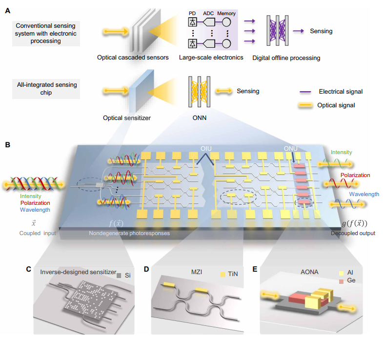 图1(A)传统多维感知系统与所提出系统架构对比;(B)全集成多维感知系统示意图;(C)基于逆向设计的敏化器;(D)马赫曾德尔干涉器;(E)全光非线性激活单元。