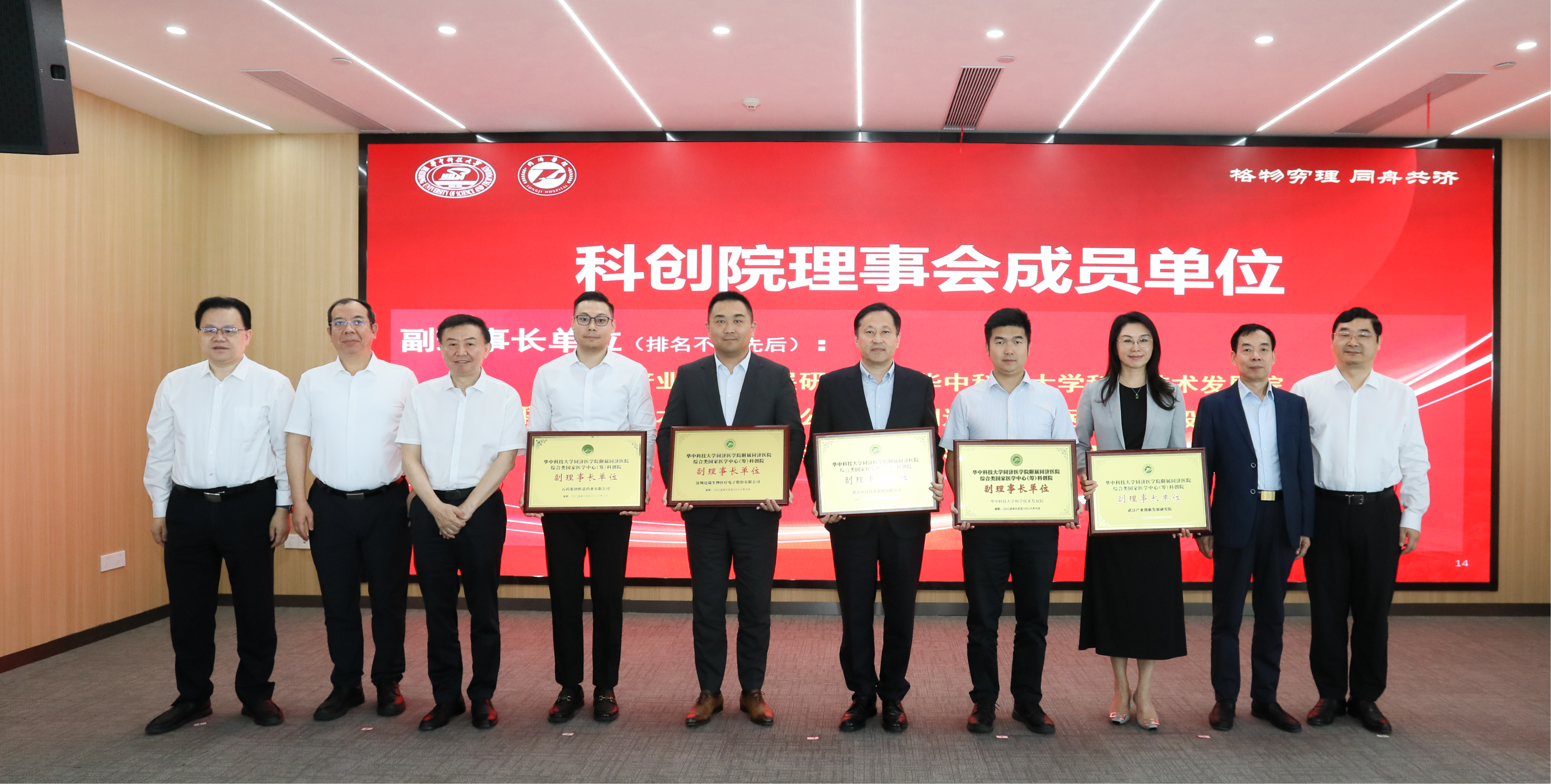 理事会成员单位授牌仪式同期举行。理事会由理事长单位(同济医院)、9家副理事长单位及31家理事单位构成,汇聚了国内外顶尖医疗企业及科研机构。医院领导为全部成员单位授牌。大会审议并表决通过了《科创院理事会章程》。