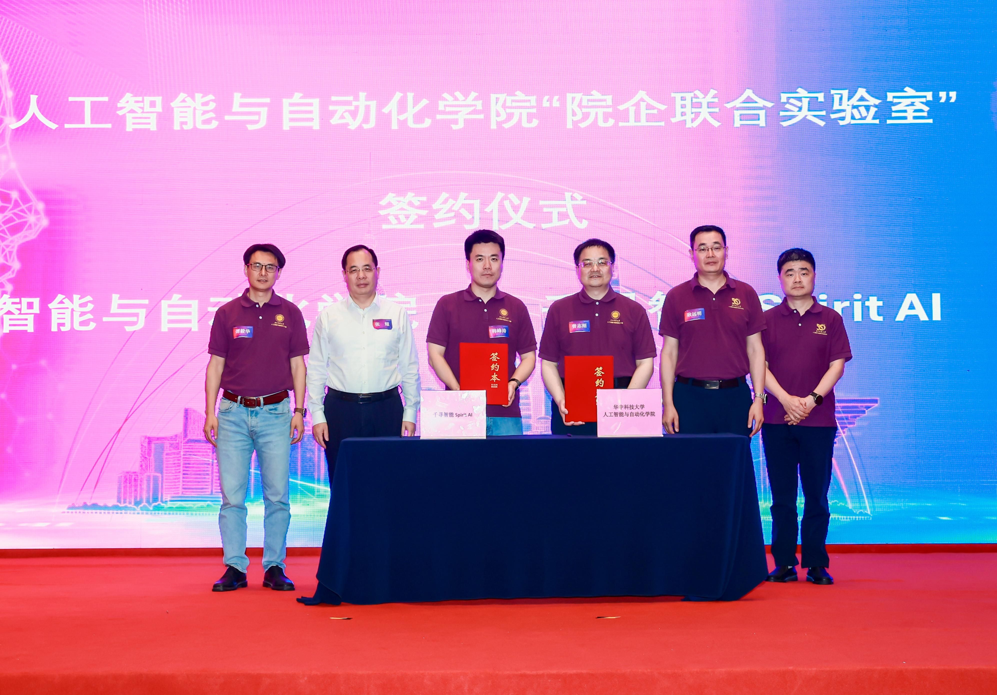曾志刚与珠海派诺科技有限公司CEO邓翔分别代表校企双方签署协议。珠海派诺科技有限公司华中负责人郭震、软件负责人王炜,张耀、耿远明、谭毅华、钟胜共同见证。曾志刚与千寻智能CEO韩峰涛分别代表校企双方签署合作协议。张耀、耿远明、谭毅华、钟胜共同见证。