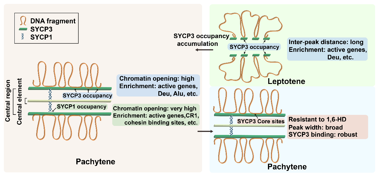 减数分裂是配子发生过程中形成单倍体细胞的关键步骤,在此过程中的染色质结构不同于体细胞,同源染色体间形成联会复合体(synaptonemal complex,SC)结构,伴随着DNA双链断裂的形成和修复来介导同源染色体的识别和重组。SC是减数分裂特异性蛋白质复合物,SC前体在精母细胞减数分裂I期的细线期中开始出现,并在粗线期形成完整的结构。SYCP3是形成SC结构侧轴的核心蛋白,可自发组装成纤维状结构,并通过其DNA结合结构域与染色质直接作用,从而产生高度凝缩的染色体轴。SYCP3的缺失阻碍了雄性小鼠的减数分裂和配子发生。破译减数分裂染色质结构对于揭示同源染色体识别和重组的机制具有重要价值。尽管目前有多篇文献报道了利用超分辨显微成像技术对SC的超微结构进行分析,但SYCP3在减数分裂过程中全基因组的分布变化及其调控知之甚少。