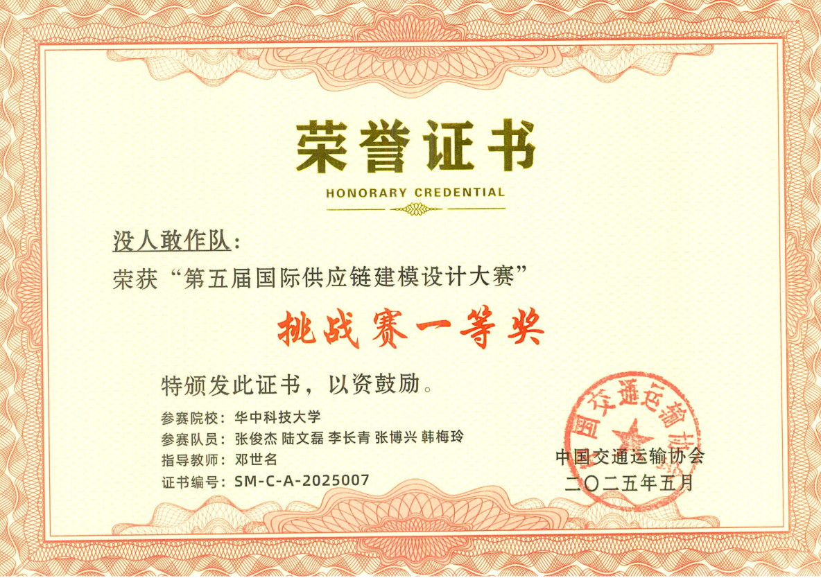 新闻网讯 近日,第五届国际供应链建模设计大赛落下帷幕,我校管理学院代表队“无人敢作队”获“挑战赛”赛道国赛一等奖。