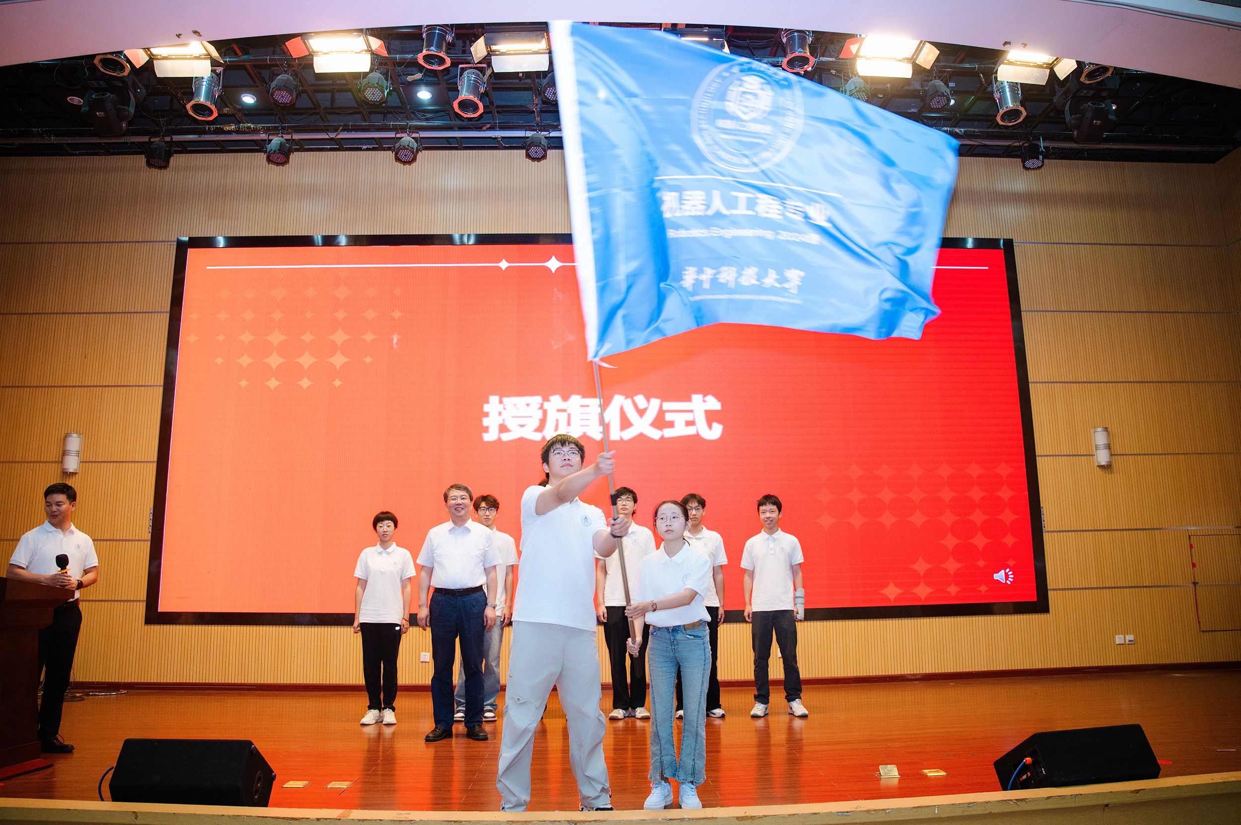 丁汉回顾了自己在学校学习的日子,勉励同学们勇攀科技高峰,在机器人创新道路上坚定前行。丁汉将象征专业使命与荣光的旗帜授予2024级学生代表,标志着新生正式成为“机器人工程”专业的一员,激励大家扛起责任、勇担使命。