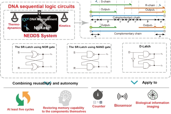 NEDDS系统由五条DNA链和一种切刻内切酶组成。以NEDDS系统为基础构建的三种锁存器具有自主性与可复用性(元件至少能实现5个循环),并被应用于构建可逆计数器及动态生物信息传感中。