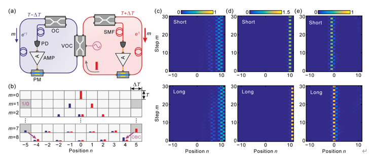 图1.(a)嵌入光电前馈链路的双光纤环路构造原理示意图。(b)时域光子晶格构造原理示意图。(c)-(e)线性趋肤模式、非线性趋肤模式和非线性体模式演化实验结果图。