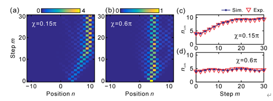 图2. (a),(b)低非线性系数和高非线性系数下的光路由实验结果图。(c), (d)低非线性系数和高非线性系数下的光场质心演化图。
