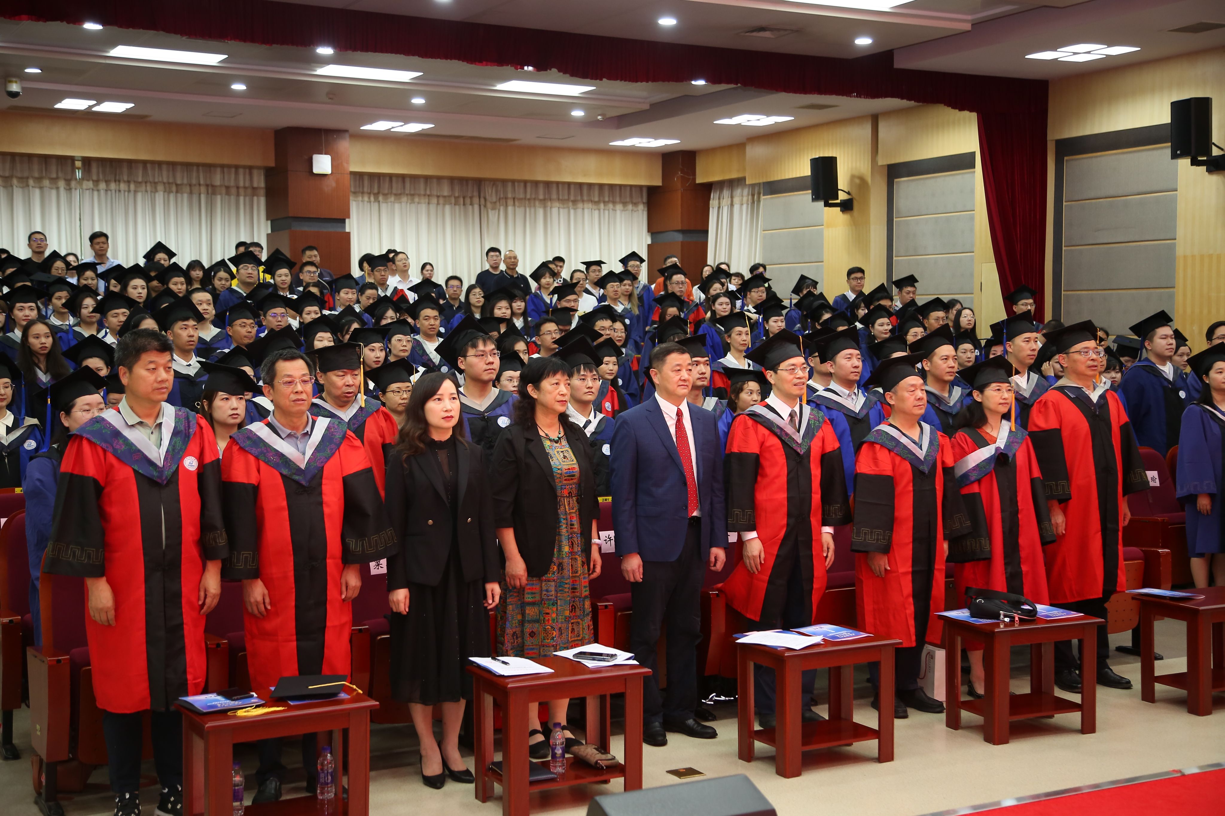 学院党委书记刘芳主持学位授予仪式。导师逐一走上讲台,为毕业生拨穗正冠、颁发学位证书。