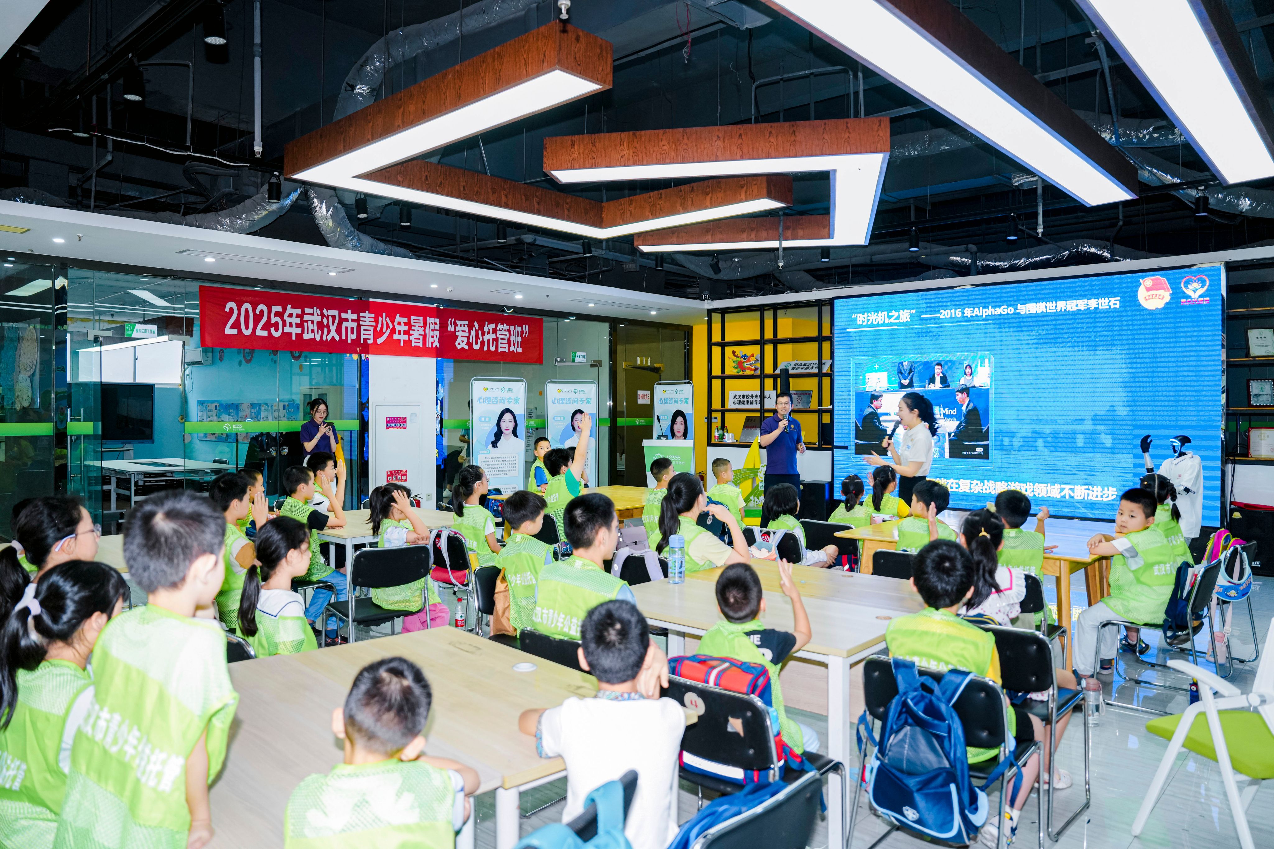 本次活动覆盖多个托管班,西部计划(研究生支教团)志愿者李昱泉、青马学员张睿婷分别在江岸区星空大楼青少年空间和武昌区茶港青少年空间教学点位同步开讲。后续,我校将组织一批经过专业培训的青年科技志愿者携带智能设备走进更多社区,让“AI之光”照亮更多孩子的暑假,让科技的种子在荆楚少年的心中生根发芽。