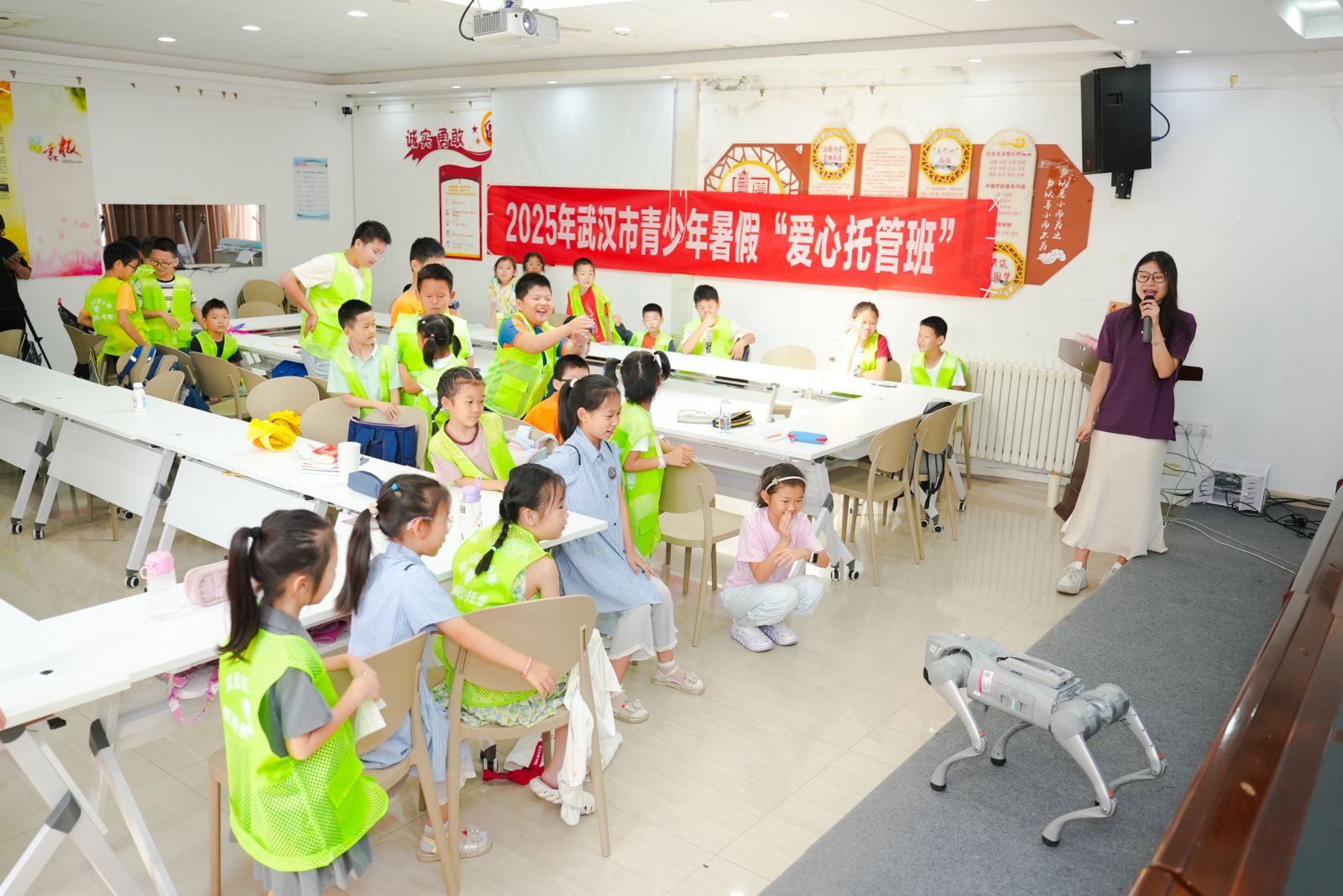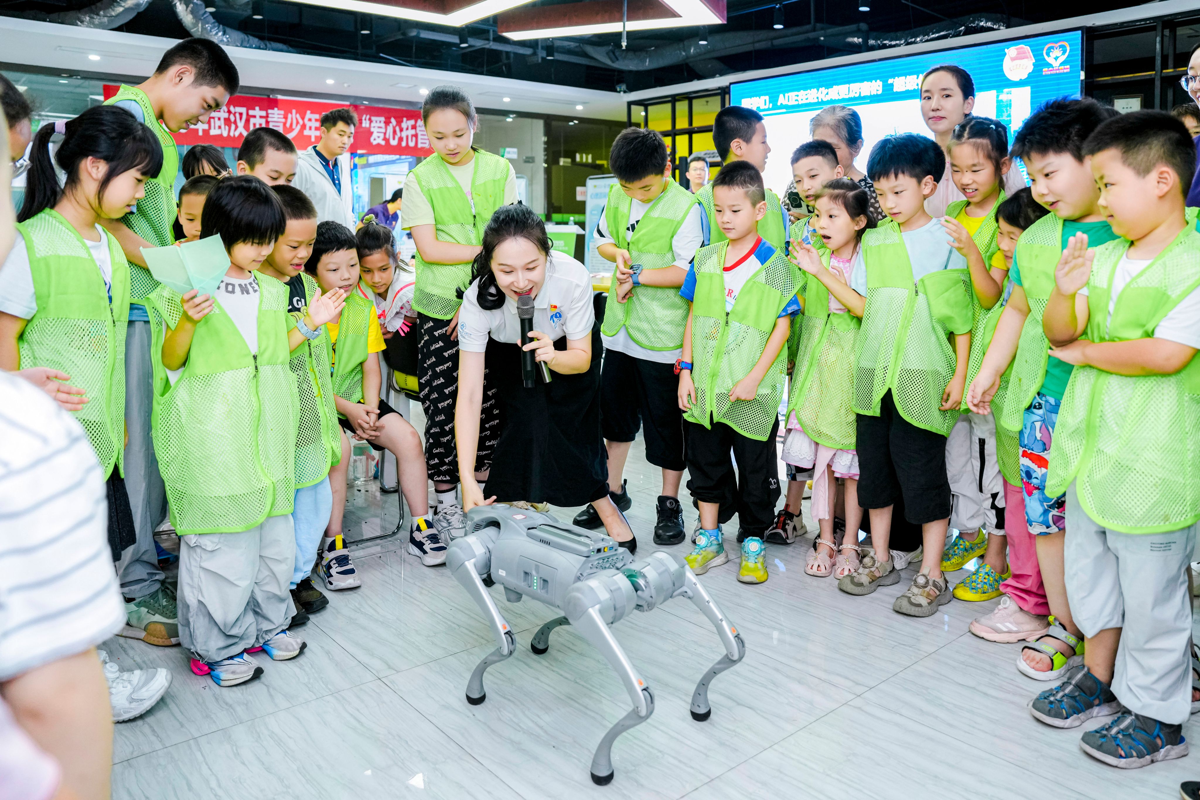 新闻网讯 7月7日,由共青团湖北省委指导、校团委联合人工智能与自动化学院精心打造的“跟老师一起挖掘AI的奥秘”人工智能科普课在武汉市青少年宫火热开讲。我校志愿者带来人形机器人、机器狗等设备,点燃了一颗颗好奇的童心,激发着他们对未来的无限遐想。