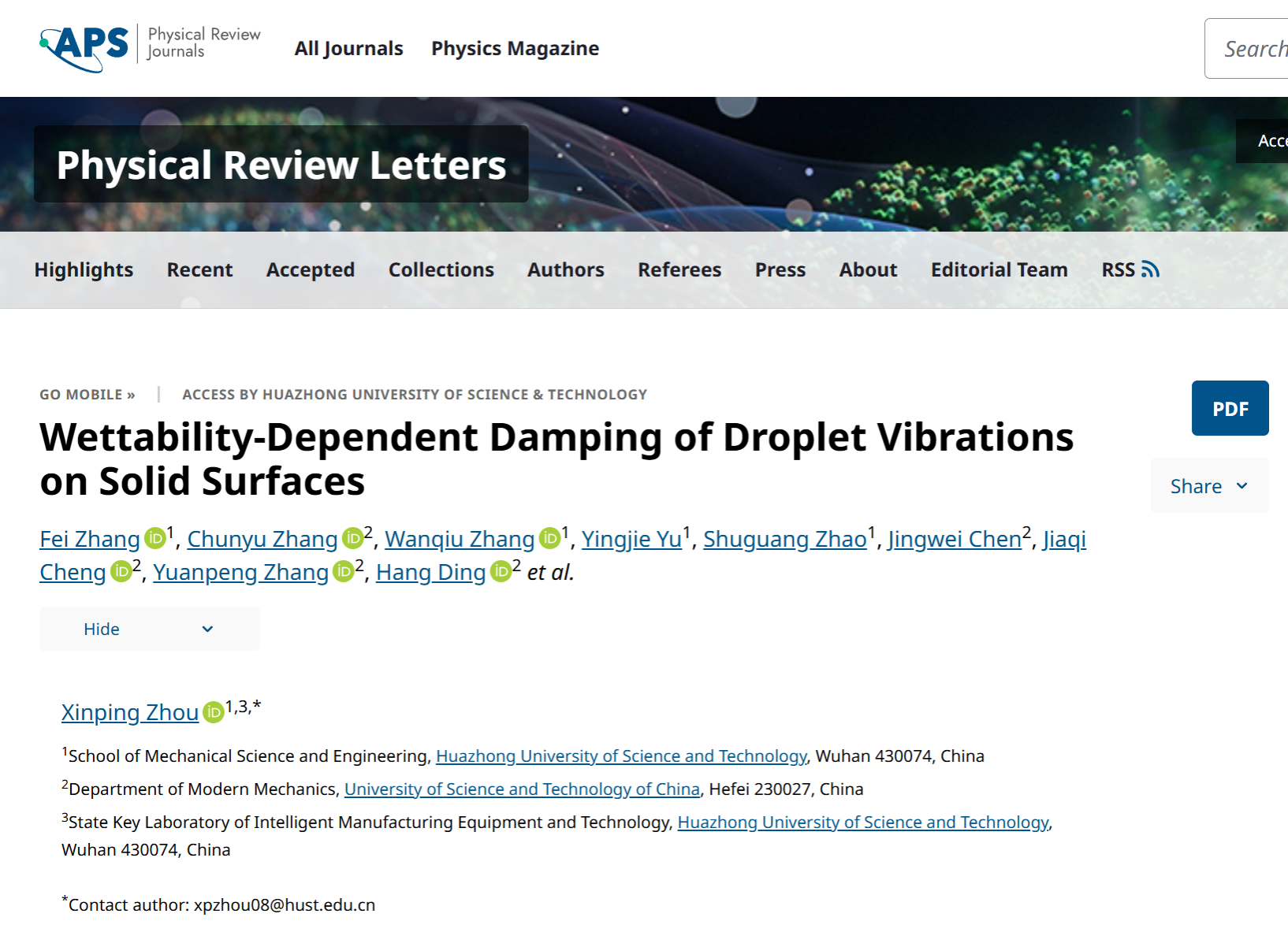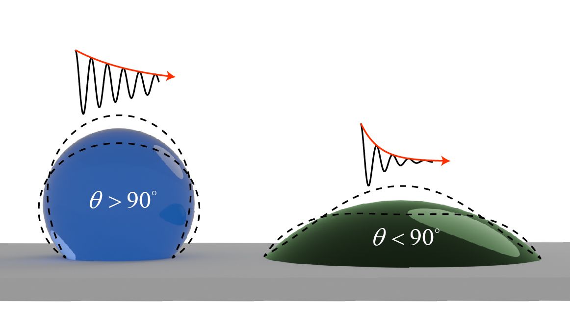 新闻网讯 7月8日,机械学院周新平教授团队在液滴振动阻尼机理研究方面取得新进展,相关成果以“Wettability-Dependent Damping of Droplet Vibrations on Solid Surfaces(固体表面液滴振动的润湿性依赖阻尼特性)”为题,在线发表在物理学顶级期刊Physical Review Letters(物理评论快报)上。学院青年教师张飞为第一作者,周新平为通讯作者,合作者包括中国科学技术大学近代力学系特任副研究员张春雨、教授丁航等。值得一提的是,这项成果是rabey雷竞技在流体力学方向首次以第一/通讯单位在该期刊发表论文,也是学院第一篇以第一/通讯单位发表于该期刊的研究工作,标志着我校在流体力学基础研究国际前沿的重要突破。