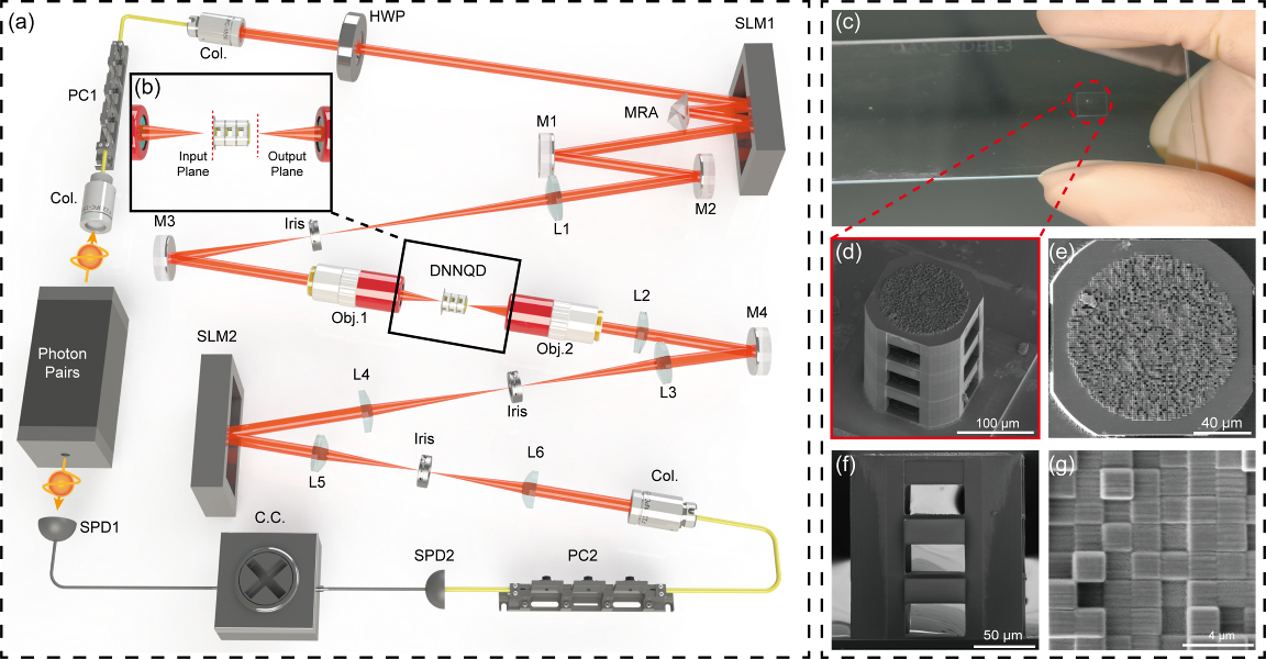 该研究基于空间衍射神经网络(Diffractive Neural Network, DNN)多平面光转换(MPLC)技术,发展了一种聚合物基MPLC三维光子集成芯片,用于在光子的空间模式自由度中实现高维量子逻辑门。该芯片采用双光子聚合飞秒激光直写(femtosecond laser direct writing, FLDW)技术在聚合物材料中制备而成,整体结构紧凑,具备微米级加工精度,适用于集成化和小型化应用场景。研究团队设计并实现了一个三维Hadamard量子门结构,并在单光子水平上进行了空间模式下的量子过程层析,实验测得的保真度为90%。
