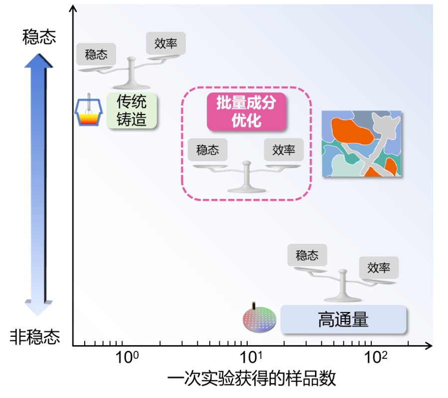 成分设计是材料科学的基础。现有的材料成分设计主要有两种方式:一种是传统的单次制备法,该方法每次仅合成一个特定成分的样品,具有结构稳定、成分可控等优点,适用于机理研究,但制备效率较低;另一种是以磁控溅射为代表的高通量制备法,能够在一次实验中获得多个不同组成的样品,提升了搜索效率,但制备出的样品多为非稳态结构,难以重复合成或应用于实际场景。