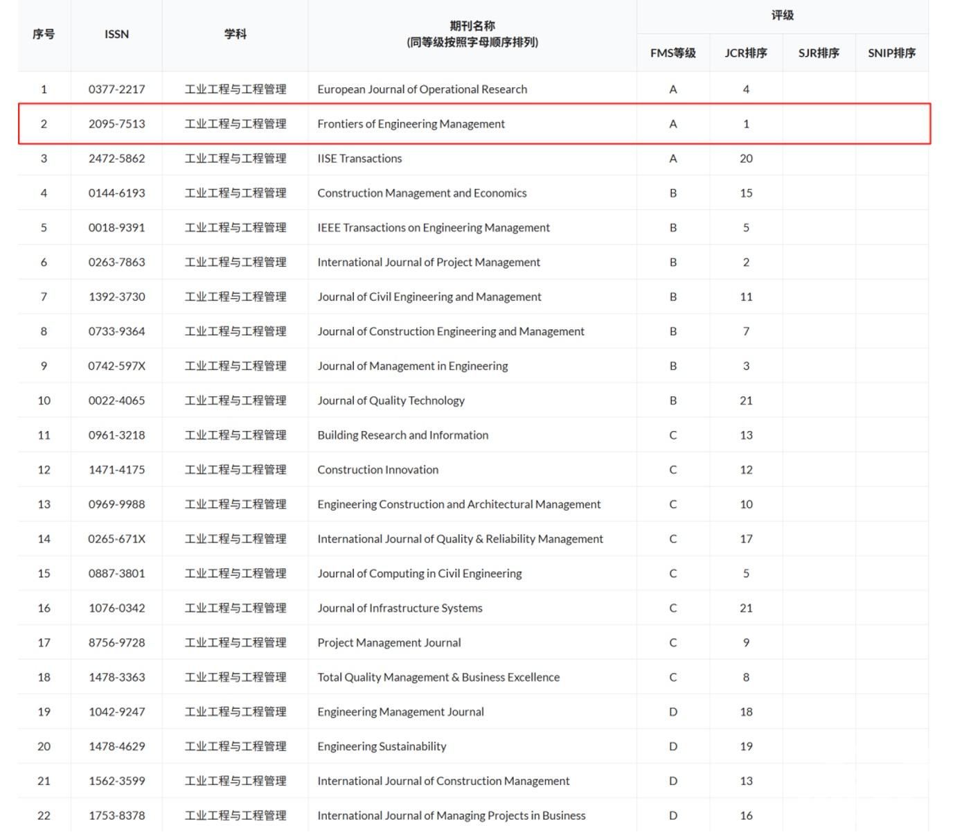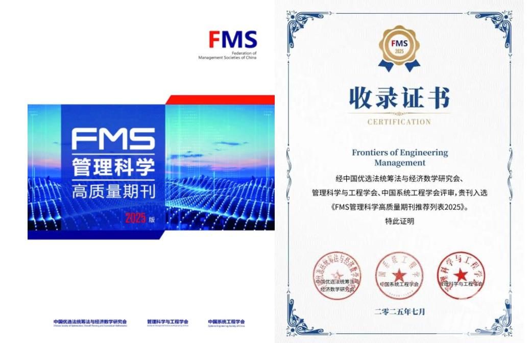 新闻网讯 7月7日,《FMS管理科学高质量期刊推荐列表(2025版)》由中国优选法统筹法与经济数学研究会、管理科学与工程学会及中国系统工程学会联合正式发布。中国工程院院刊《工程管理前沿(英文)》(Frontiers of Engineering Management)入选《FMS管理科学高质量期刊推荐列表(2025版)》“工业工程与工程管理”类A级期刊。