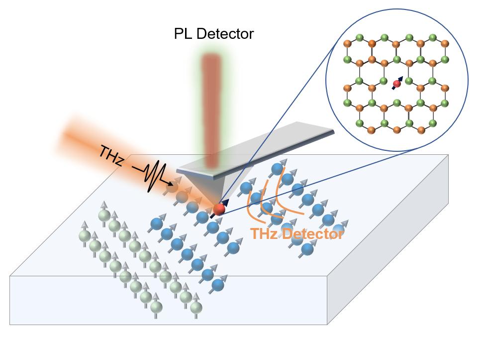 图1、全光学埃米级量子磁成像原理示意图。将二维范德瓦尔斯体系中的固态缺陷结构与太赫兹近场光学显微镜结合,实现高分辨率磁结构成像