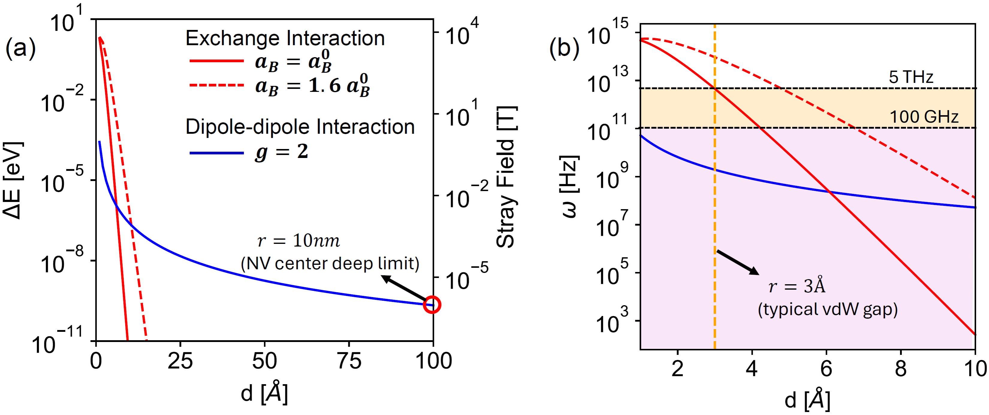 通过精确控制探针与样品间的距离至数埃范围内,使强交换相互作用成为主导(图2所示),再结合太赫兹光调控和对自旋依赖荧光信号的探测,实现对磁性信息的高灵敏度和高空间分辨率读取。与依赖微波或机械谐振系统的磁成像手段相比,该方法完全使用光学手段,具有更强的系统兼容性,对样品的扰动更小,同时显著简化了实验装置的复杂性以及对实验条件的要求。