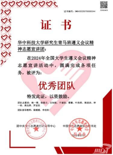 新闻网讯(通讯员 崔鹏硕)近日,团中央青年志愿者行动指导中心、中国青年志愿者协会、中共遵义市委、共青团贵州省委公布2024年全国大学生遵义会议精神志愿宣讲团队评优结果。我校研究生青马班遵义会议精神志愿宣讲团凭借扎实的实践成果、独特的宣讲理念从全国1000支立项团队中脱颖而出,入选全国“优秀团队”“优秀宣讲视频”。