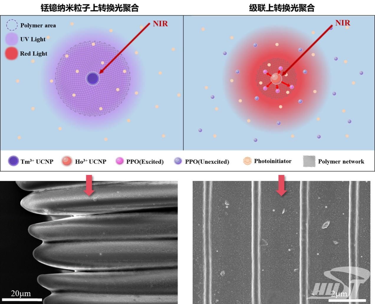 图1 级联上转换与传统铥镱纳米粒子上转换光刻的对比