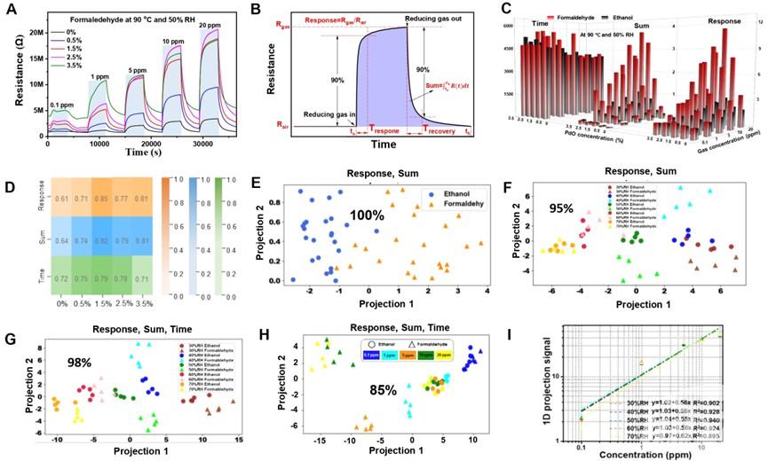 该策略基于半导体气敏材料和机器学习算法的协同设计,通过对氧化物半导体表面活性和电子结构的调控,结合传感器阵列化进行动力学特征组合编码,采用线性判别分析(Linear discriminant analysis, LDA)算法进行解码,提高了甲醛检测的选择性。以此为基础进行降维拟合,建立起定量检测的数学模型并揭示出气味编码机制遵循质量作用定律,同时验证了二元混合物分析的适应性。基于MACO的机器嗅觉感知模型可解释性强,可根据实际应用场景的特点进行迭代设计和性能优化,提高电子鼻机器嗅觉系统的环境适应性。
