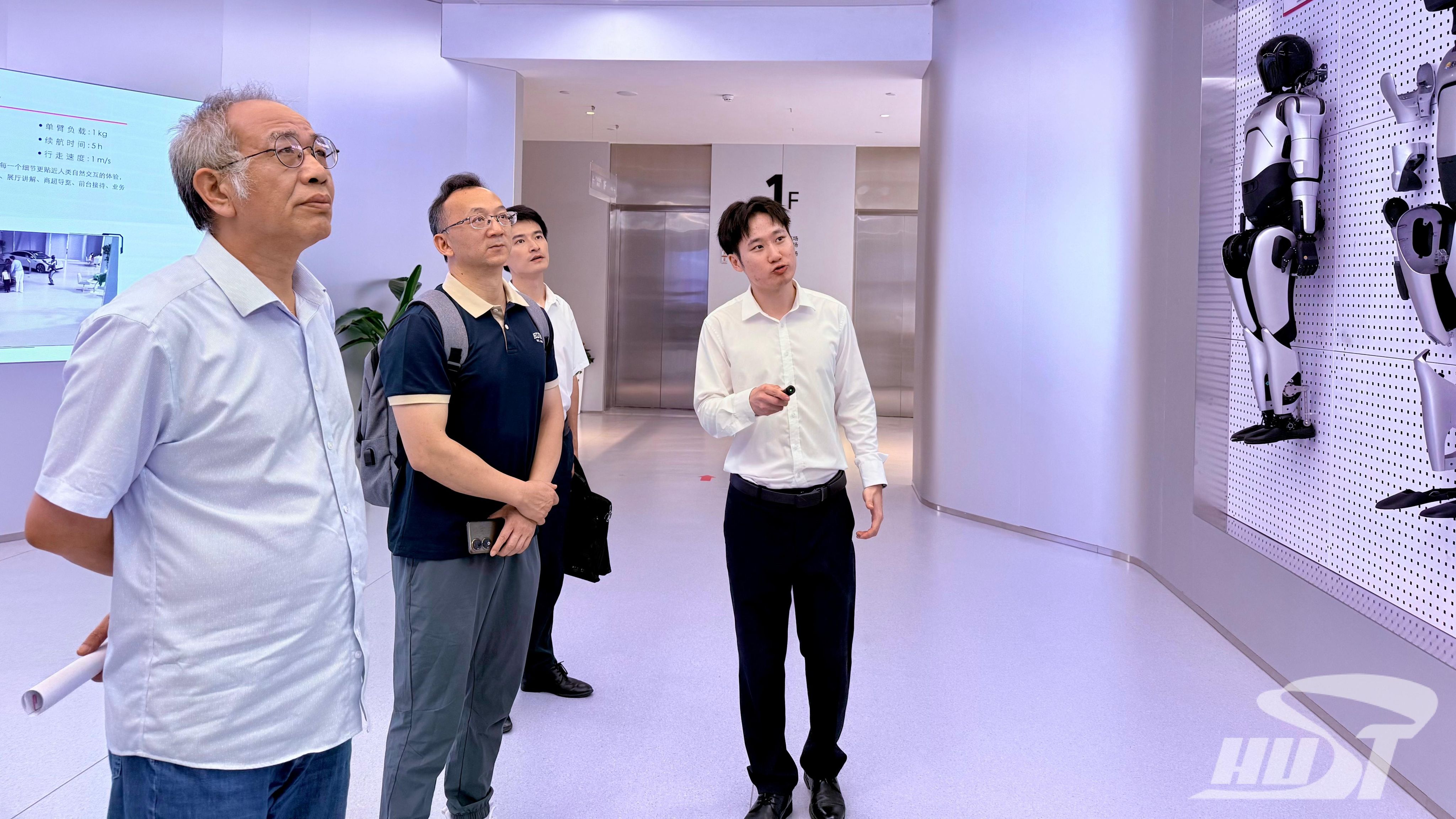 调研团观看了湖北人形机器人创新中心的宣传片,参观了机器人展示区、模型训练场、应用实践场及数据采集场;学习了解了多款分别侧重不同功能的机器人,以及其在前台、超市、药房、餐饮、护理、流水线,以及复杂环境中的应用情况。