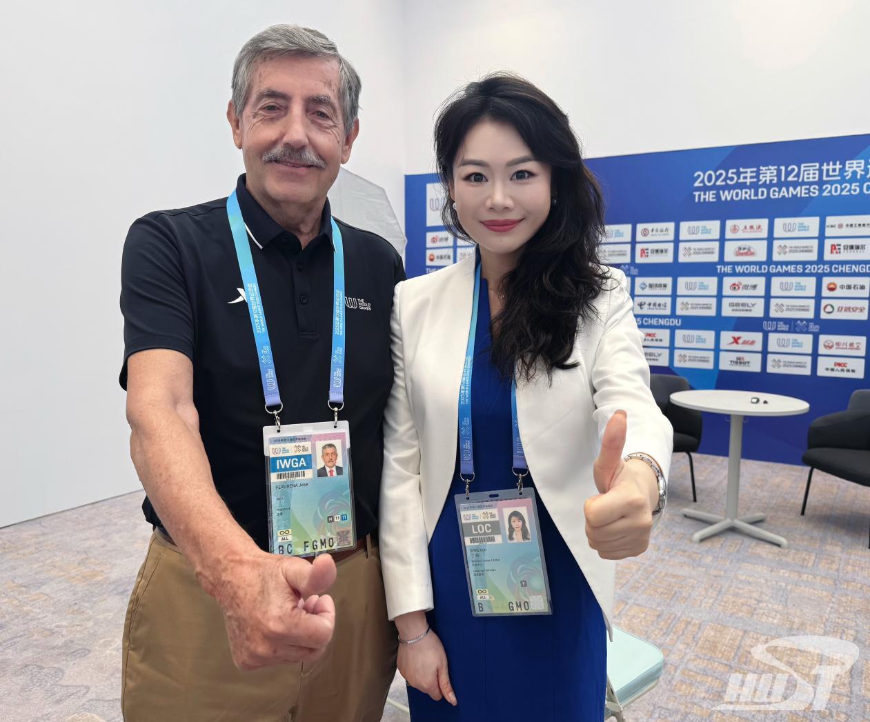 图为丁珣和国际世运会协会主席何塞·佩鲁雷纳。